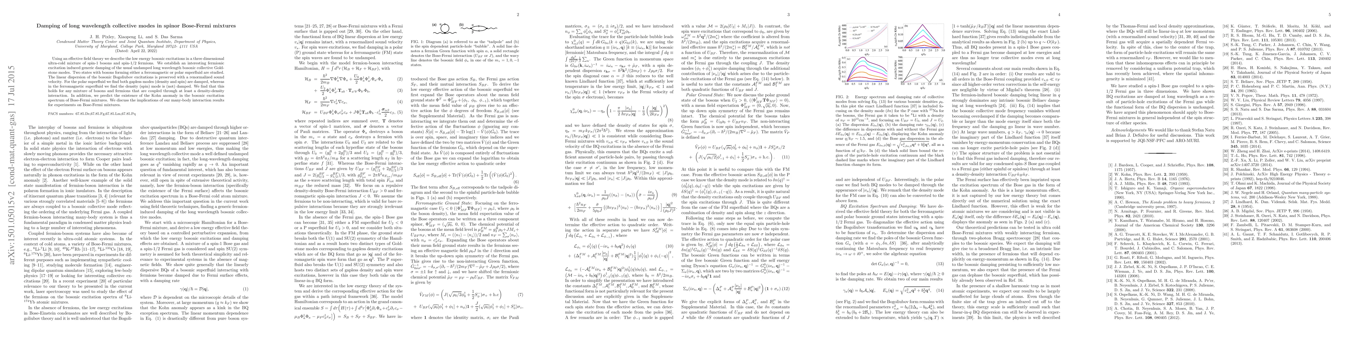 This paper uses effective field theory to analyze low-energy excitations in ultra-cold spinor Bose-Fermi mixtures, revealing that fermionic excitations induce damping in the long wavelength bosonic collective modes. The study finds that in polar superfluids, both density and spin modes are damped, while in ferromagnetic superfluids, only the density mode is damped, with implications for Bose-Fermi mixture experiments.