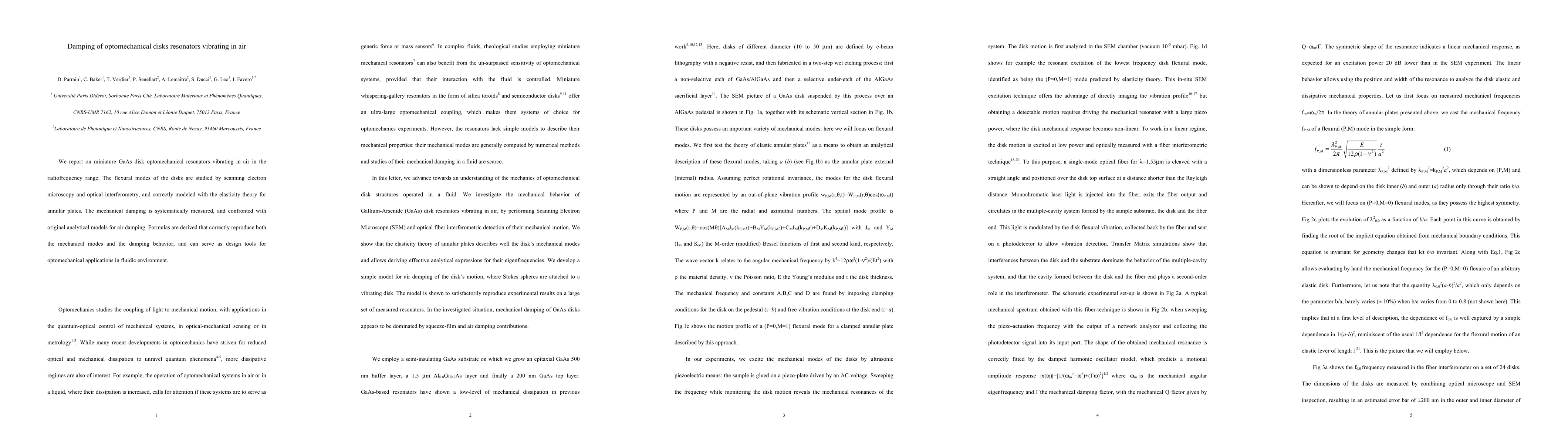 We report on miniature GaAs disk optomechanical resonators vibrating in air in the radiofrequency range. The flexural modes of the disks are studied by scanning electron microscopy and optical interferometry, and correctly modeled with the elasticity theory for annular plates. The mechanical damping is systematically measured, and confronted with original analytical models for air damping. Formulas are derived that correctly reproduce both the mechanical modes and the damping behavior, and can serve as design tools for optomechanical applications in fluidic environment.