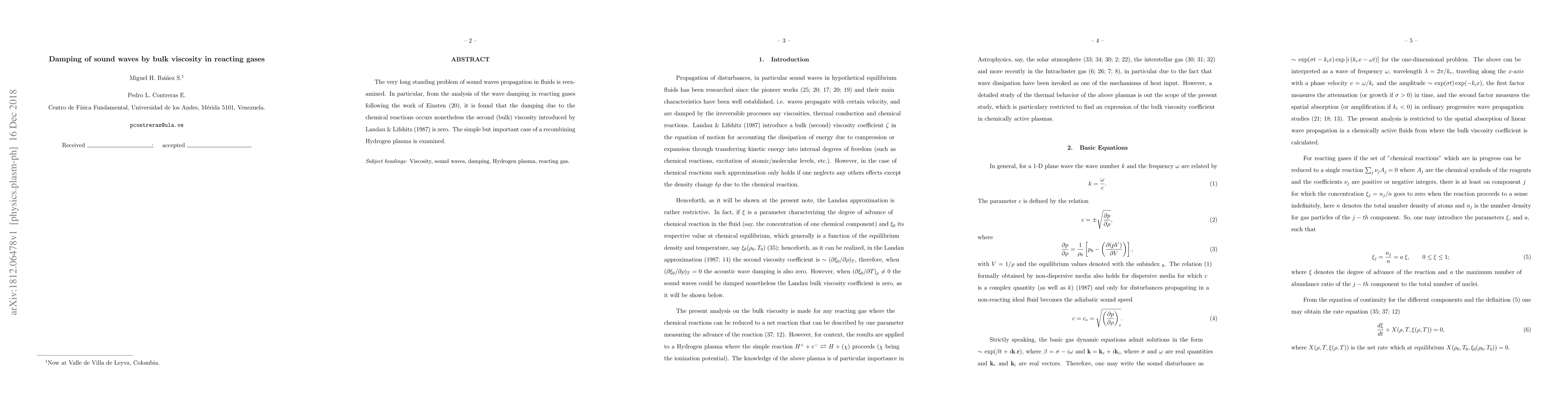 The very long standing problem of sound waves propagation in fluids is reexamined. In particular, from the analysis of the wave damping in reacting gases following the work of Einsten \citep{Ein}, it is found that the damping due to the chemical reactions occurs nonetheless the second (bulk) viscosity introduced by Landau \& Lifshitz \citep{LL86} is zero. The simple but important case of a recombining Hydrogen plasma is examined.