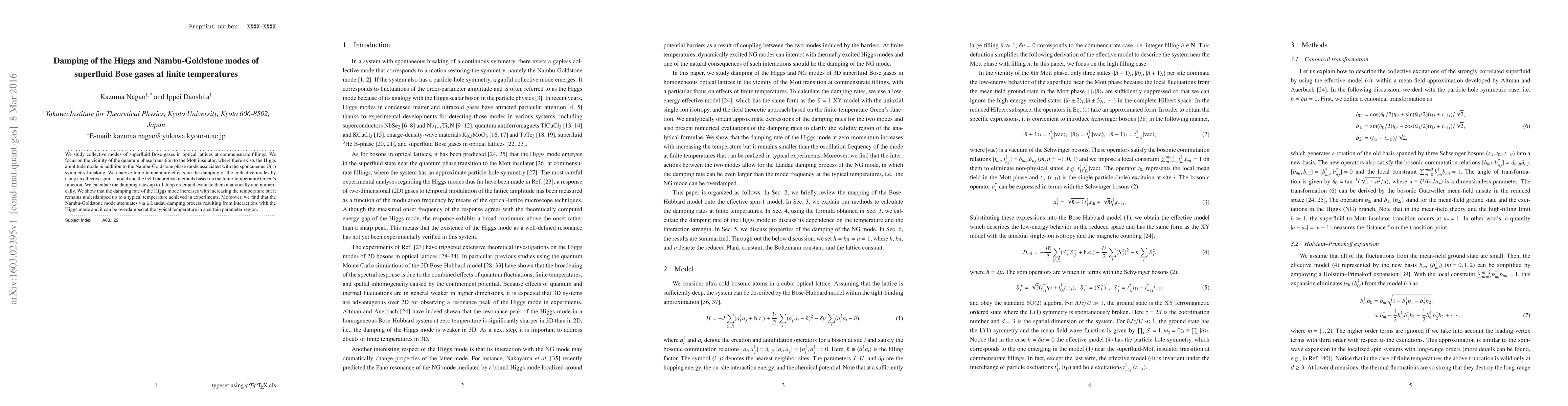 This paper investigates the damping of Higgs and Nambu-Goldstone modes in superfluid Bose gases near the quantum phase transition to a Mott insulator at finite temperatures. It finds that the Higgs mode remains underdamped while the Nambu-Goldstone mode can be overdamped due to Landau damping from interactions with the Higgs mode.