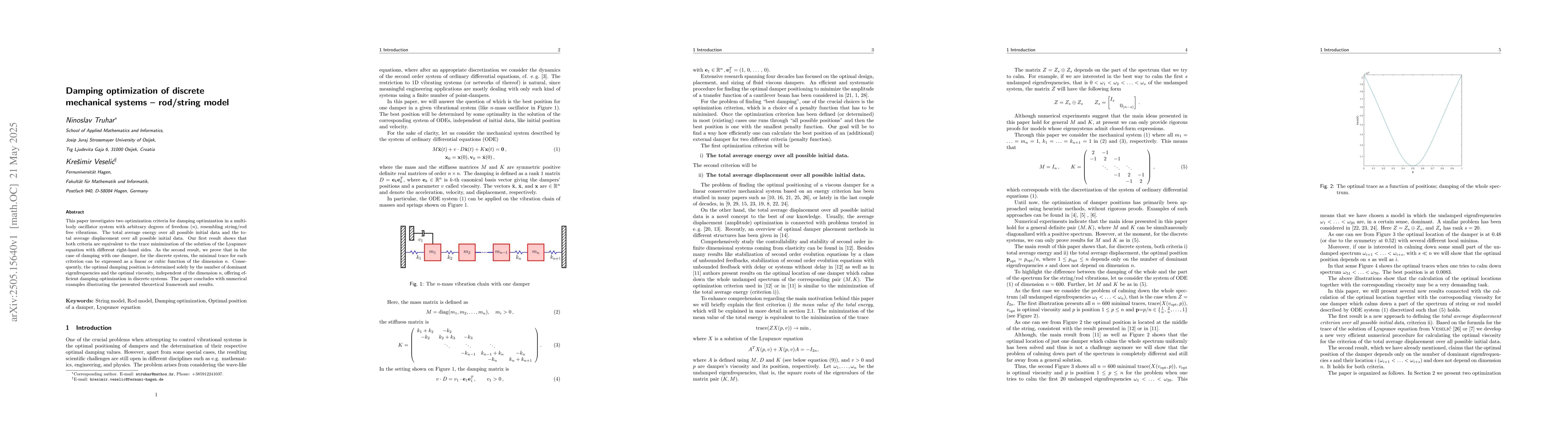 The paper presents a novel approach to damping optimization by linking energy and displacement criteria to trace minimization of Lyapunov equations, providing explicit formulas for optimal damping in one-damper discrete systems.