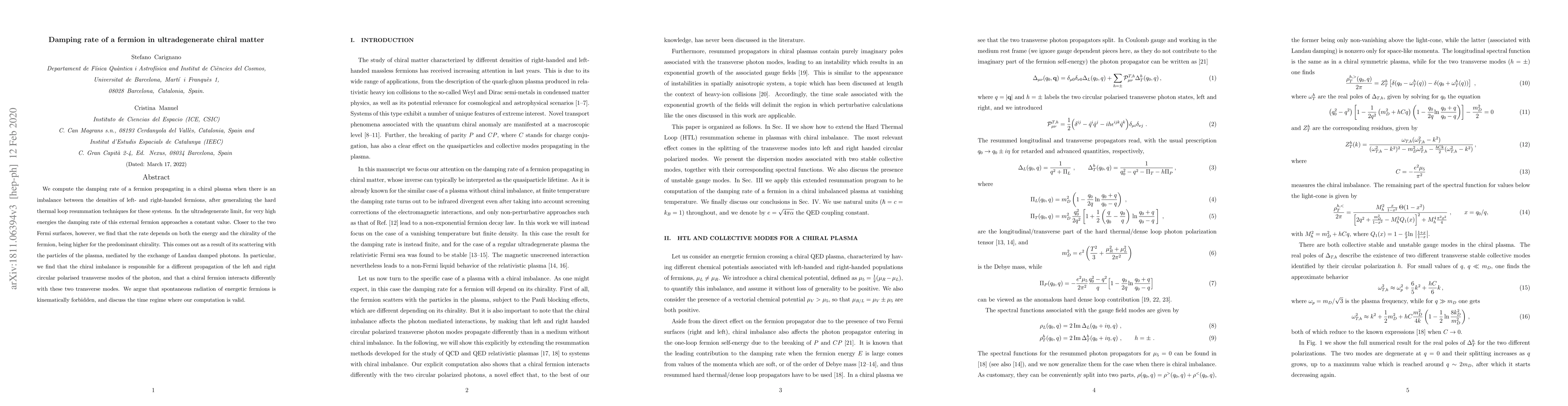 We compute the damping rate of a fermion propagating in a chiral plasma when there is an imbalance between the densities of left- and right-handed fermions, after generalizing the hard thermal loop resummation techniques for these systems. In the ultradegenerate limit, for very high energies the damping rate of this external fermion approaches a constant value. Closer to the two Fermi surfaces, however, we find that the rate depends on both the energy and the chirality of the fermion, being higher for the predominant chirality. This comes out as a result of its scattering with the particles of the plasma, mediated by the exchange of Landau damped photons. In particular, we find that the chiral imbalance is responsible for a different propagation of the left and right circular polarised transverse modes of the photon, and that a chiral fermion interacts differently with these two transverse modes. We argue that spontaneous radiation of energetic fermions is kinematically forbidden, and discuss the time regime where our computation is valid.