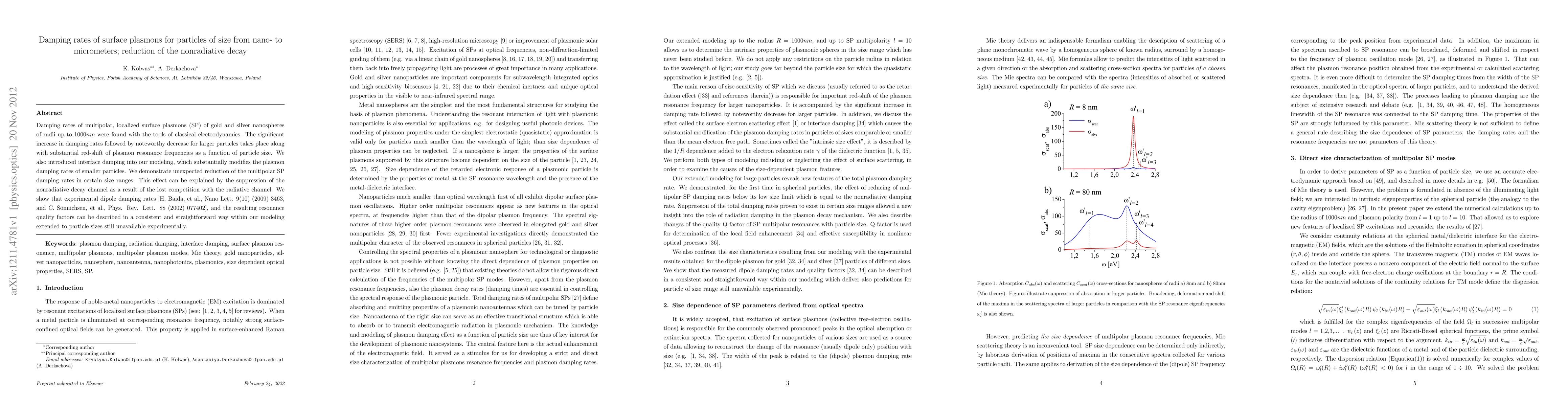This paper investigates the damping rates of localized surface plasmons in gold and silver nanospheres, revealing a significant increase followed by a decrease for larger particles. The study introduces interface damping, explaining the unexpected reduction in multipolar plasmon damping rates due to the suppression of nonradiative decay.