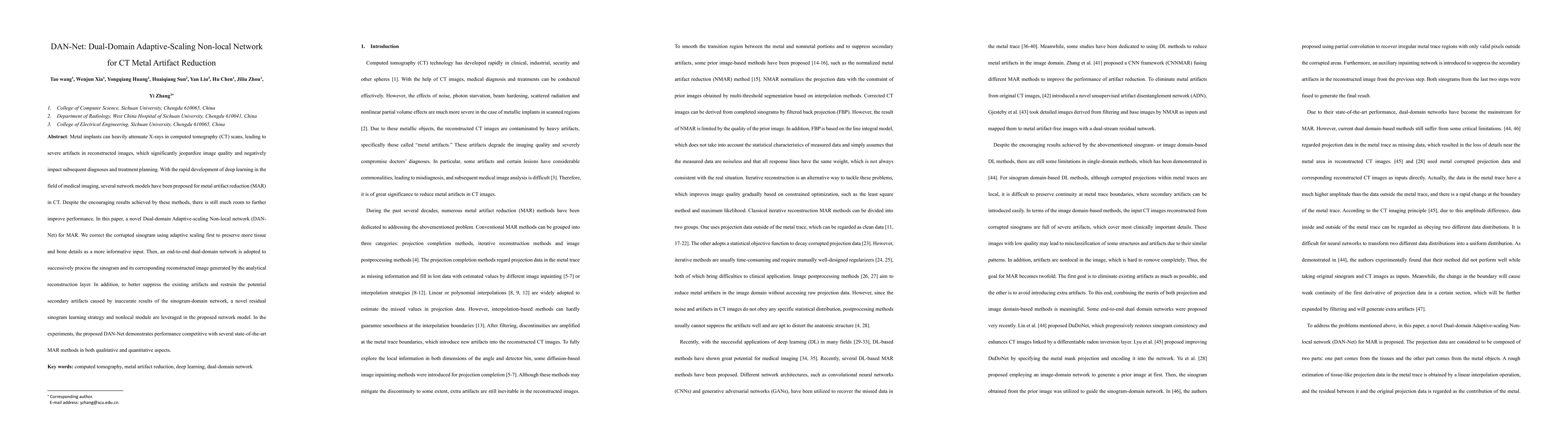 DAN-Net introduces a dual-domain adaptive-scaling non-local network for CT metal artifact reduction, enhancing image quality by correcting sinograms and utilizing residual learning and nonlocal modules. The method shows competitive performance against state-of-the-art techniques in both qualitative and quantitative evaluations.