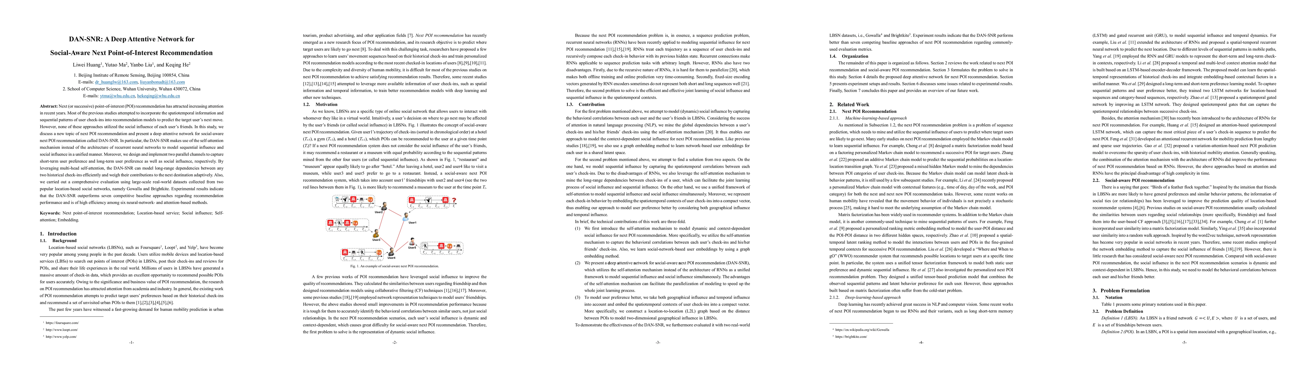 The DAN-SNR model employs a deep attentive network with self-attention mechanisms to recommend the next point-of-interest, incorporating both sequential and social influences. Experimental results show it outperforms other methods in both performance and efficiency on real-world datasets.
