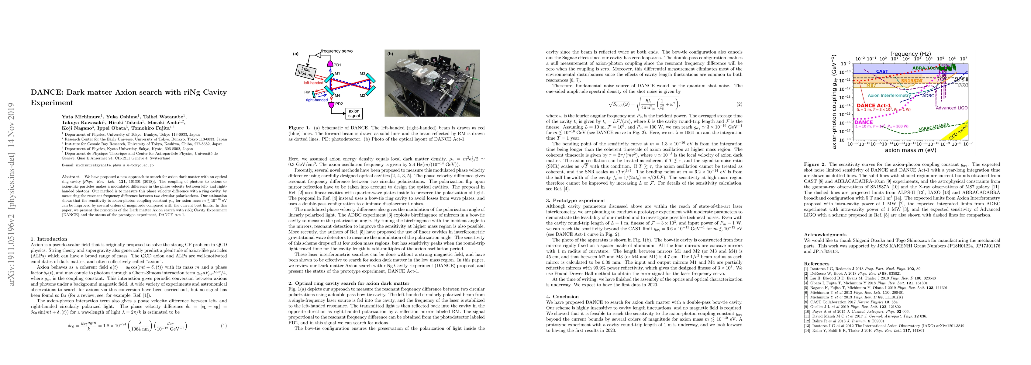 The DANCE experiment proposes a novel method using an optical ring cavity to detect axion dark matter by measuring the phase velocity difference between left- and right-handed photons. The prototype experiment, DANCE Act-1, aims to improve the sensitivity to axion-photon coupling by several orders of magnitude compared to current limits.