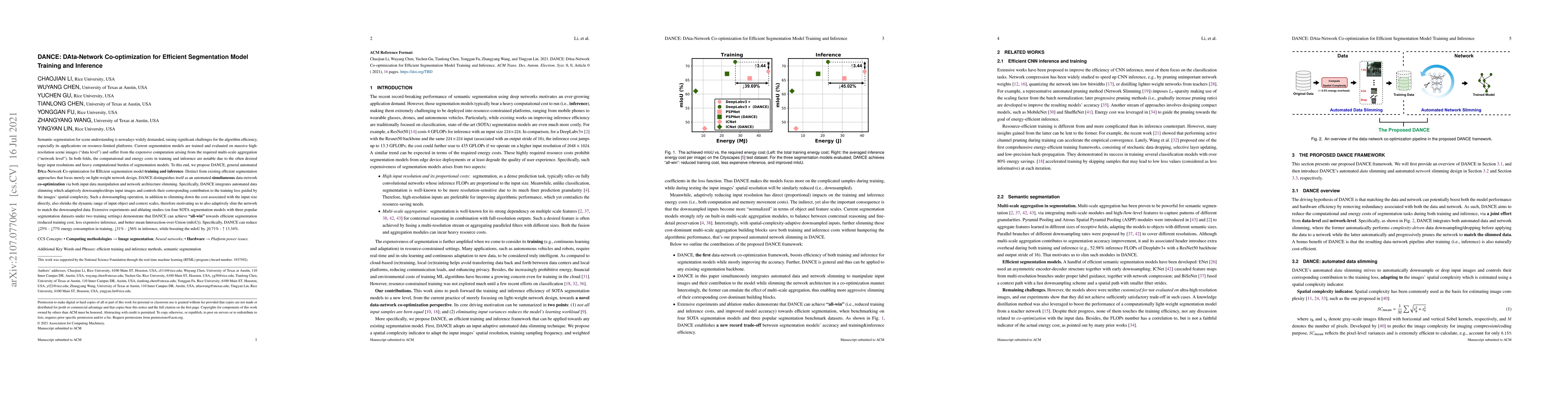This paper proposes DANCE, a method that optimizes both data and network for efficient segmentation models, reducing training cost and inference time while maintaining high accuracy.