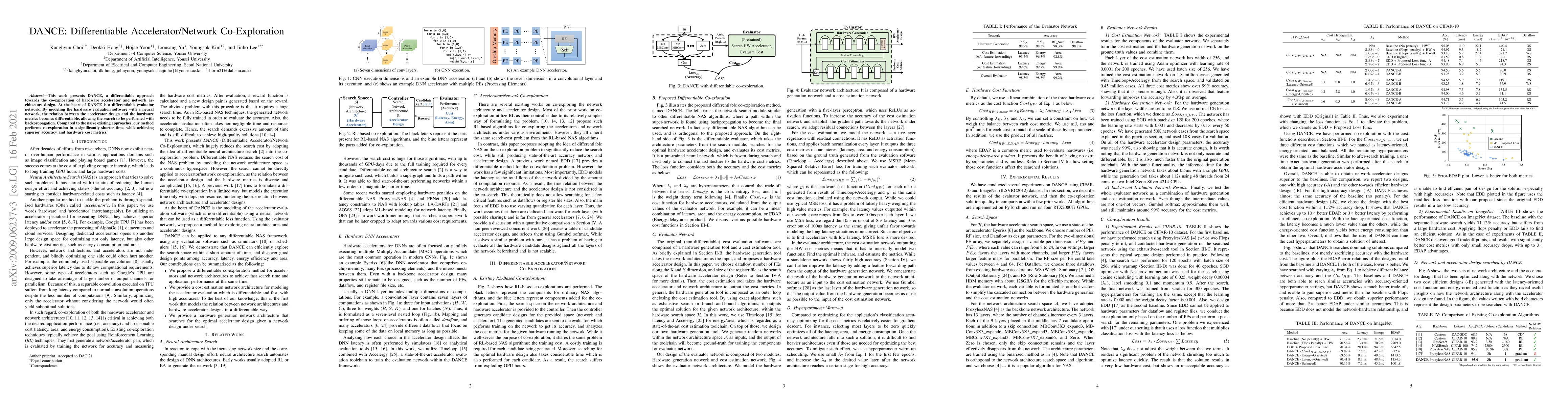 DANCE introduces a differentiable approach for co-exploring neural network architectures and DNN-specialized hardware accelerators, leveraging a differentiable evaluator network to optimize both components simultaneously, achieving faster convergence and better performance compared to traditional methods.