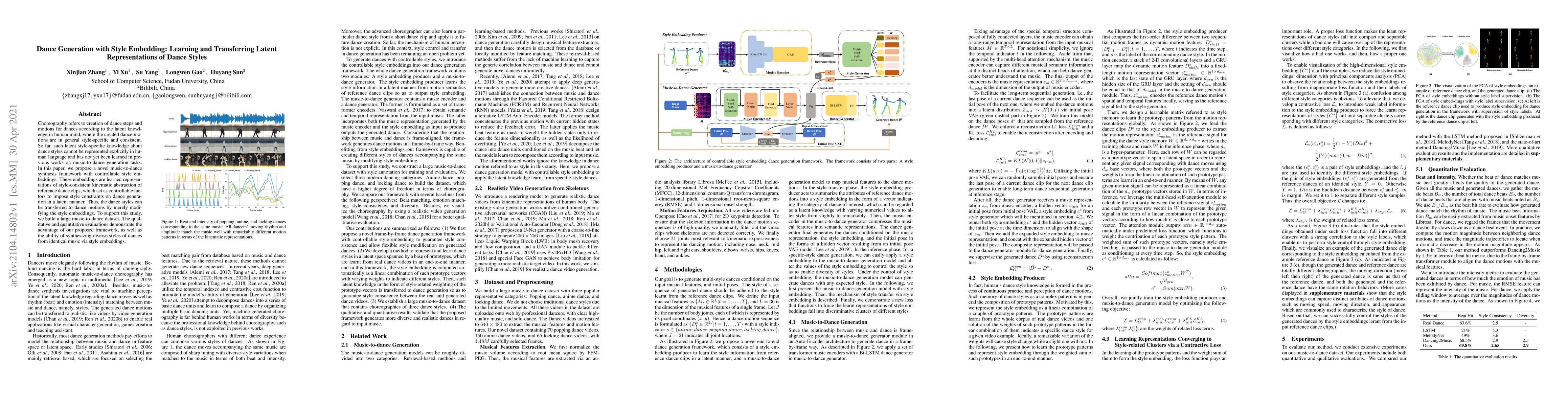 This paper introduces a music-to-dance synthesis framework with controllable style embeddings, enabling the transfer of latent style-specific knowledge to generated dance motions. The proposed method learns style embeddings from reference dance clips to impose style constraints on dance generation, allowing for diverse style synthesis from a single piece of music.