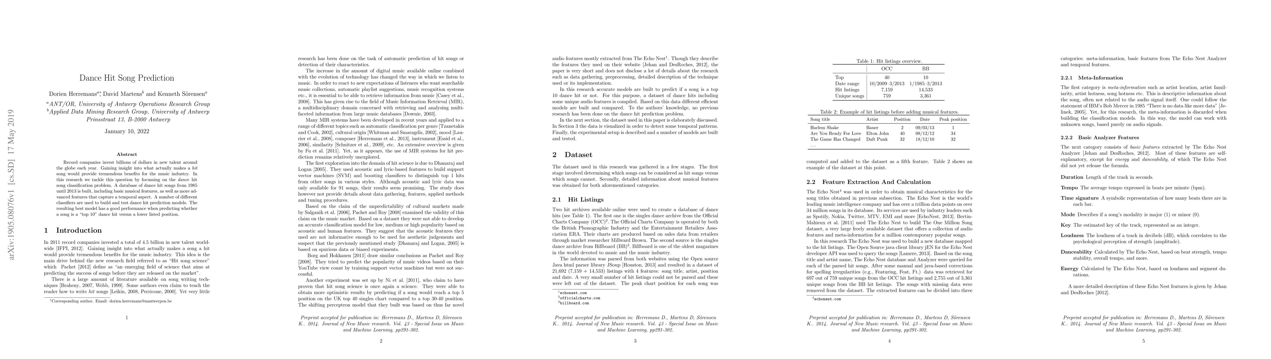 Record companies invest billions of dollars in new talent around the globe each year. Gaining insight into what actually makes a hit song would provide tremendous benefits for the music industry. In this research we tackle this question by focussing on the dance hit song classification problem. A database of dance hit songs from 1985 until 2013 is built, including basic musical features, as well as more advanced features that capture a temporal aspect. A number of different classifiers are used to build and test dance hit prediction models. The resulting best model has a good performance when predicting whether a song is a "top 10" dance hit versus a lower listed position.