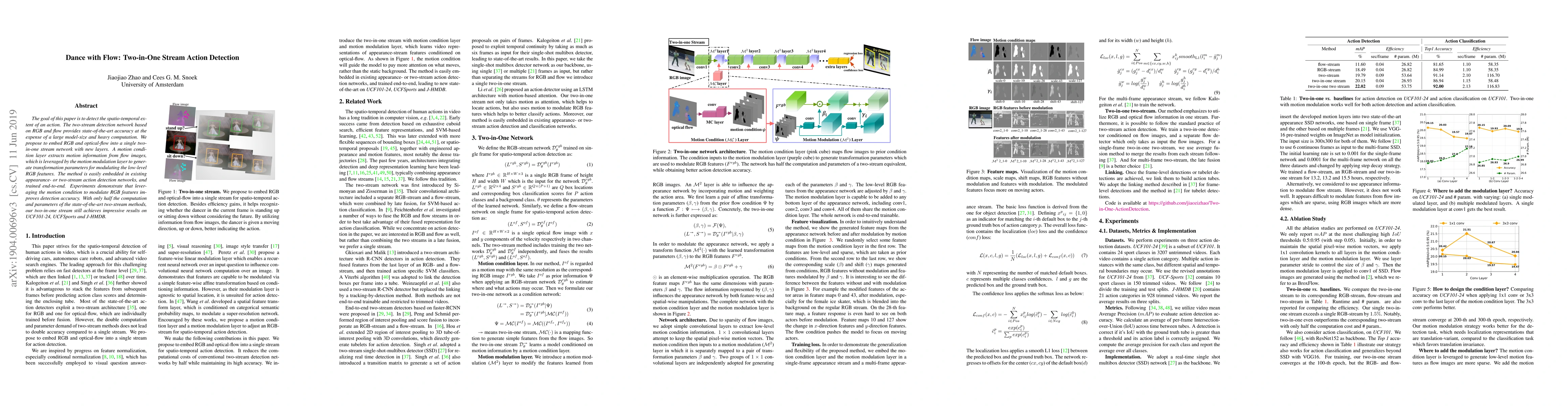 This paper proposes a two-in-one stream network for action detection that integrates RGB and optical flow into a single model, improving accuracy while reducing computational cost and model size compared to traditional two-stream methods. The method uses a motion condition layer to extract motion information and a motion modulation layer to enhance RGB features, achieving state-of-the-art results on several datasets.