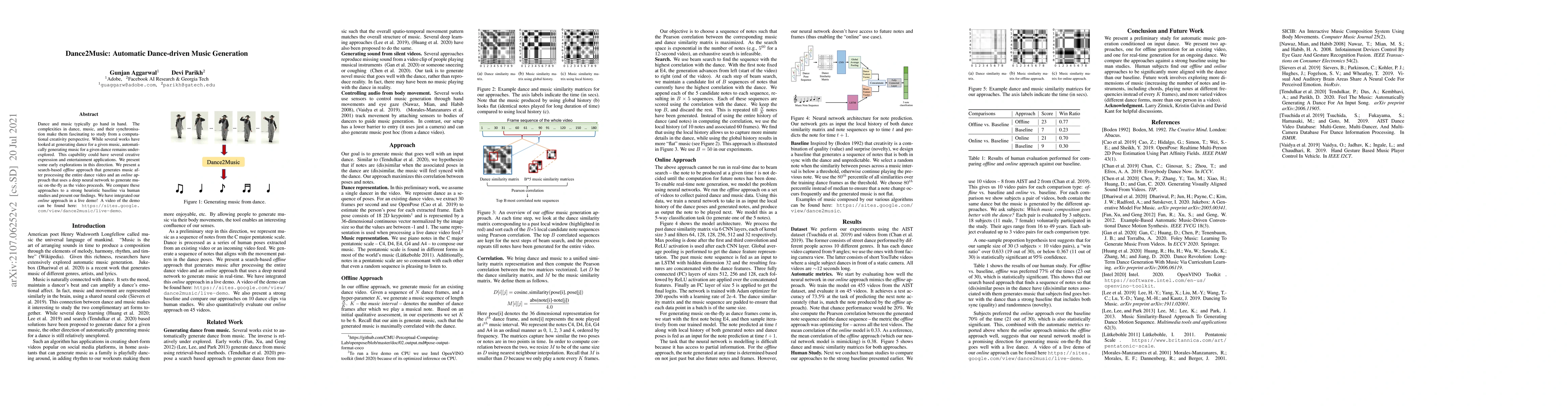 This paper explores the automatic generation of music based on dance input, presenting both offline and online methods. The offline approach processes the entire dance video before generating music, while the online approach uses a deep neural network to generate music in real-time. The effectiveness of these methods is evaluated through human studies and a live demo is showcased.