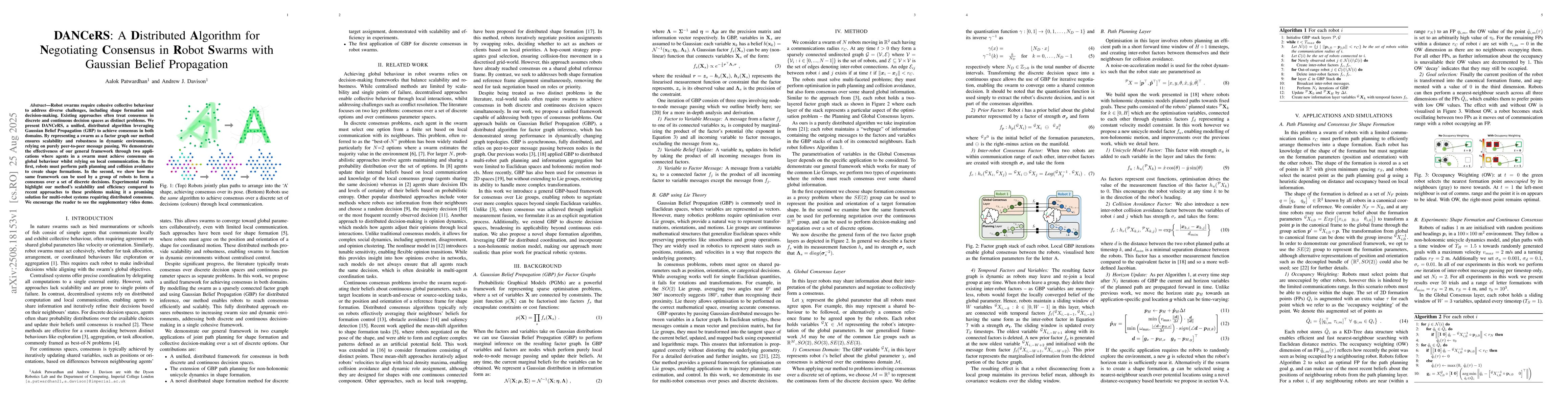 Robot swarms require cohesive collective behaviour to address diverse challenges, including shape formation and decision-making. Existing approaches often treat consensus in discrete and continuous decision spaces as distinct problems. We present DANCeRS, a unified, distributed algorithm leveraging Gaussian Belief Propagation (GBP) to achieve consensus in both domains. By representing a swarm as a factor graph our method ensures scalability and robustness in dynamic environments, relying on purely peer-to-peer message passing. We demonstrate the effectiveness of our general framework through two applications where agents in a swarm must achieve consensus on global behaviour whilst relying on local communication. In the first, robots must perform path planning and collision avoidance to create shape formations. In the second, we show how the same framework can be used by a group of robots to form a consensus over a set of discrete decisions. Experimental results highlight our method's scalability and efficiency compared to recent approaches to these problems making it a promising solution for multi-robot systems requiring distributed consensus. We encourage the reader to see the supplementary video demo.