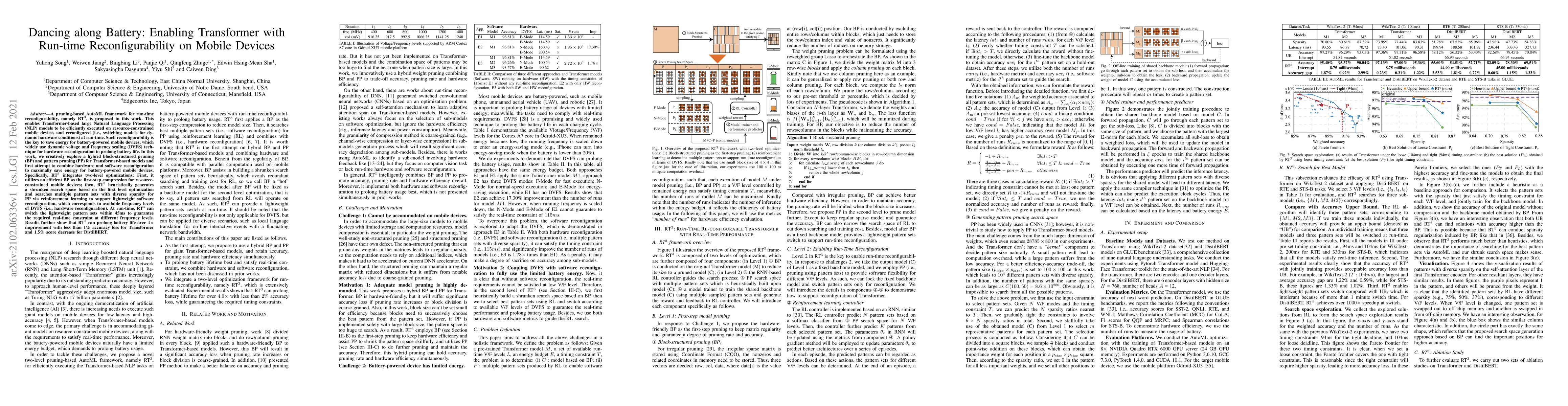 This paper proposes RT3, a pruning-based AutoML framework that enables run-time reconfigurability for Transformer-based NLP models on mobile devices, combining hardware and software optimizations to save energy and prolong battery life. RT3 employs a hybrid pruning method and reinforcement learning to switch lightweight models within 45ms, achieving over 4x battery life improvement with minimal accuracy loss.