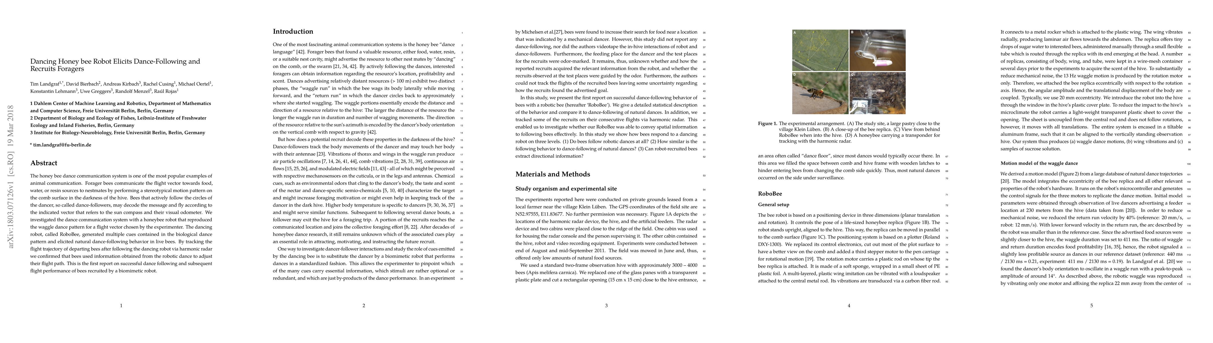 The honey bee dance communication system is one of the most popular examples of animal communication. Forager bees communicate the flight vector towards food, water, or resin sources to nestmates by performing a stereotypical motion pattern on the comb surface in the darkness of the hive. Bees that actively follow the circles of the dancer, so called dance-followers, may decode the message and fly according to the indicated vector that refers to the sun compass and their visual odometer. We investigated the dance communication system with a honeybee robot that reproduced the waggle dance pattern for a flight vector chosen by the experimenter. The dancing robot, called RoboBee, generated multiple cues contained in the biological dance pattern and elicited natural dance-following behavior in live bees. By tracking the flight trajectory of departing bees after following the dancing robot via harmonic radar we confirmed that bees used information obtained from the robotic dance to adjust their flight path. This is the first report on successful dance following and subsequent flight performance of bees recruited by a biomimetic robot.