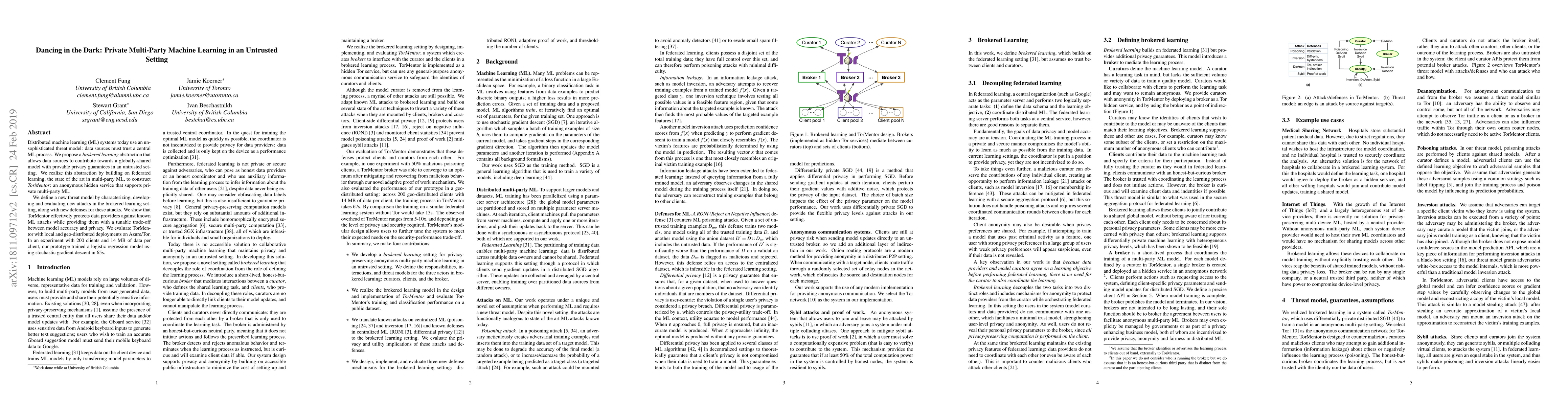 Distributed machine learning (ML) systems today use an unsophisticated threat model: data sources must trust a central ML process. We propose a brokered learning abstraction that allows data sources to contribute towards a globally-shared model with provable privacy guarantees in an untrusted setting. We realize this abstraction by building on federated learning, the state of the art in multi-party ML, to construct TorMentor: an anonymous hidden service that supports private multi-party ML. We define a new threat model by characterizing, developing and evaluating new attacks in the brokered learning setting, along with new defenses for these attacks. We show that TorMentor effectively protects data providers against known ML attacks while providing them with a tunable trade-off between model accuracy and privacy. We evaluate TorMentor with local and geo-distributed deployments on Azure/Tor. In an experiment with 200 clients and 14 MB of data per client, our prototype trained a logistic regression model using stochastic gradient descent in 65s. Code is available at: https://github.com/DistributedML/TorML