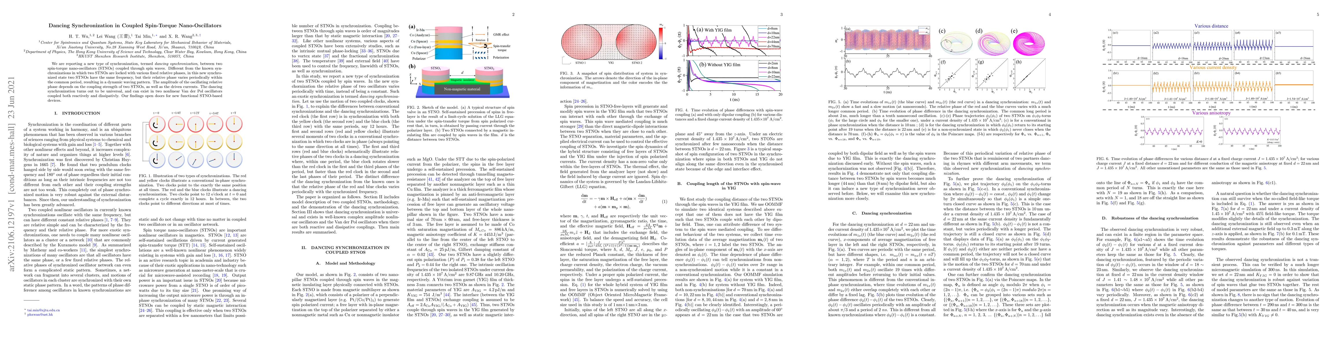 This paper reports a novel synchronization phenomenon, termed dancing synchronization, between coupled spin-torque nano-oscillators (STNOs) via spin waves, where oscillators maintain the same frequency but exhibit a periodically varying relative phase. This discovery could lead to new functionalities in STNO-based devices.