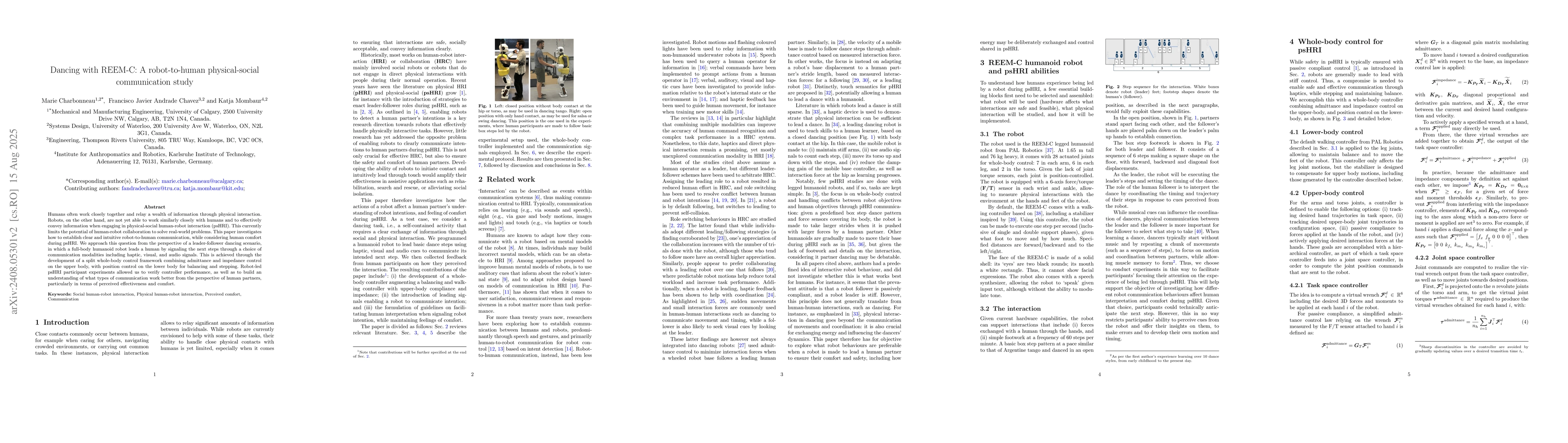 Humans often work closely together and relay a wealth of information through physical interaction. Robots, on the other hand, are not yet able to work similarly closely with humans and to effectively convey information when engaging in physical-social human-robot interaction (psHRI). This currently limits the potential of human-robot collaboration to solve real-world problems. This paper investigates how to establish clear and intuitive robot-to-human communication, while considering human comfort during psHRI. We approach this question from the perspective of a leader-follower dancing scenario, in which a full-body humanoid robot leads a human by signaling the next steps through a choice of communication modalities including haptic, visual, and audio signals. This is achieved through the development of a split whole-body control framework combining admittance and impedance control on the upper body, with position control on the lower body for balancing and stepping. Robot-led psHRI participant experiments allowed us to verify controller performance, as well as to build an understanding of what types of communication work better from the perspective of human partners, particularly in terms of perceived effectiveness and comfort.