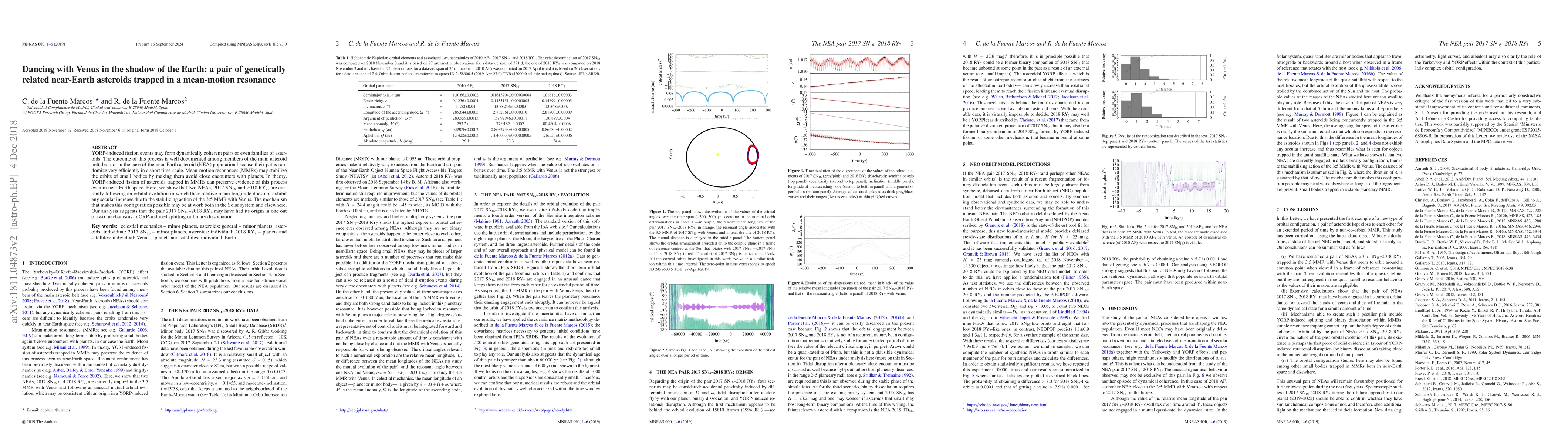 This paper identifies a pair of near-Earth asteroids, 2017 SN16 and 2018 RY7, trapped in a 3:5 mean-motion resonance with Venus, suggesting stable orbital evolution. The study proposes that these asteroids may have formed through YORP-induced fission or binary dissociation.