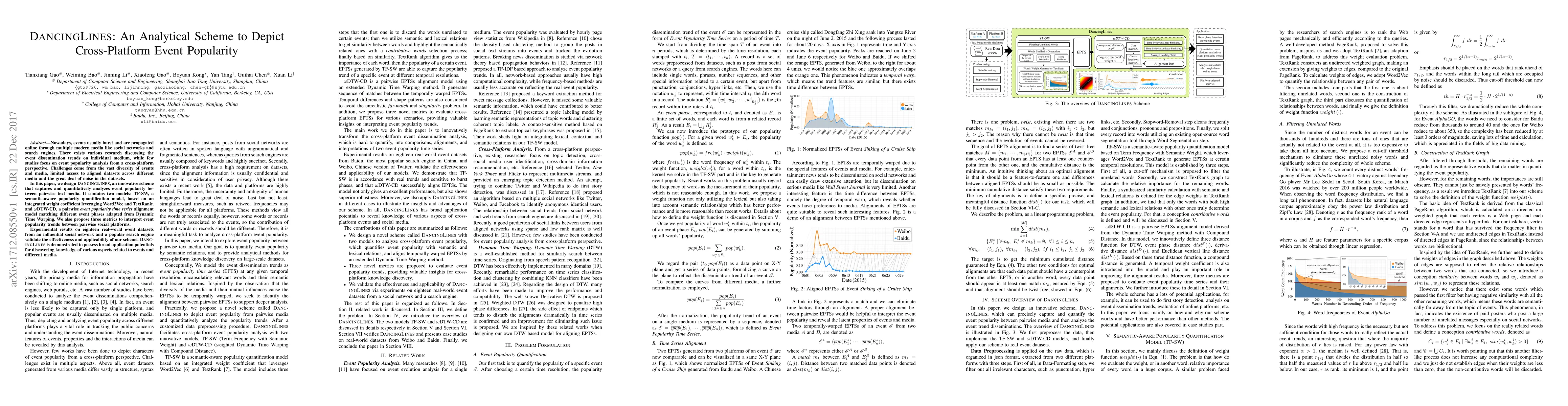 The research introduces DancingLines, a scheme analyzing event popularity across social networks and search engines. It comprises TF-SW for semantic popularity quantification and wDTW-CD for time series alignment, validated on 18 real-world datasets, demonstrating potential for diverse event and media insights.