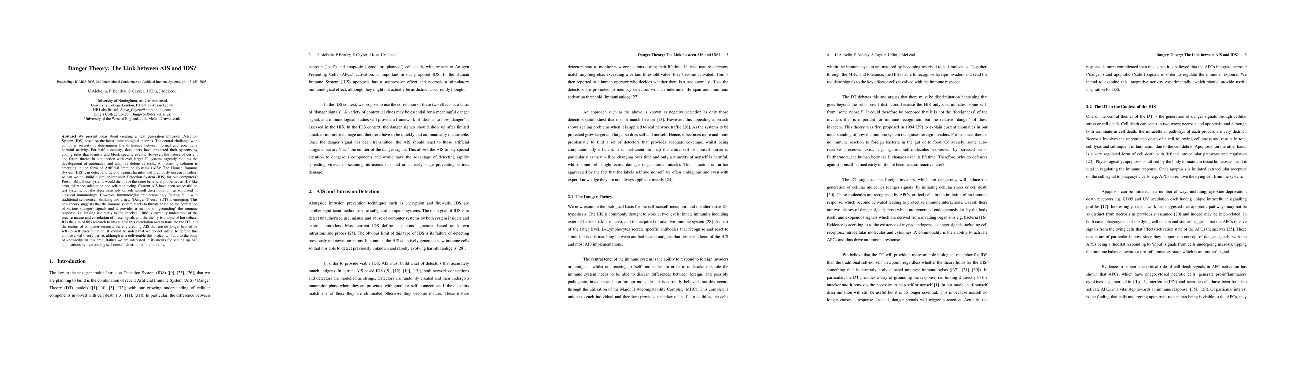 We present ideas about creating a next generation Intrusion Detection System based on the latest immunological theories. The central challenge with computer security is determining the difference between normal and potentially harmful activity. For half a century, developers have protected their systems by coding rules that identify and block specific events. However, the nature of current and future threats in conjunction with ever larger IT systems urgently requires the development of automated and adaptive defensive tools. A promising solution is emerging in the form of Artificial Immune Systems. The Human Immune System can detect and defend against harmful and previously unseen invaders, so can we not build a similar Intrusion Detection System for our computers.