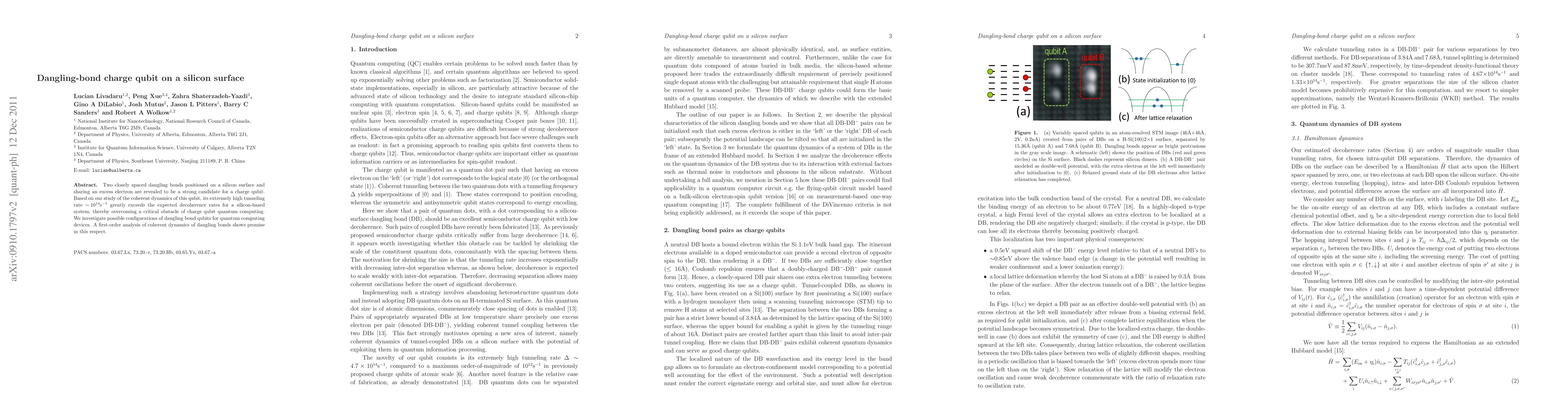 The paper presents a detailed analysis of dangling bond charge qubits on silicon surfaces, including their coherent dynamics, Hamiltonian formulation, and decoherence mechanisms using the spin-boson model.