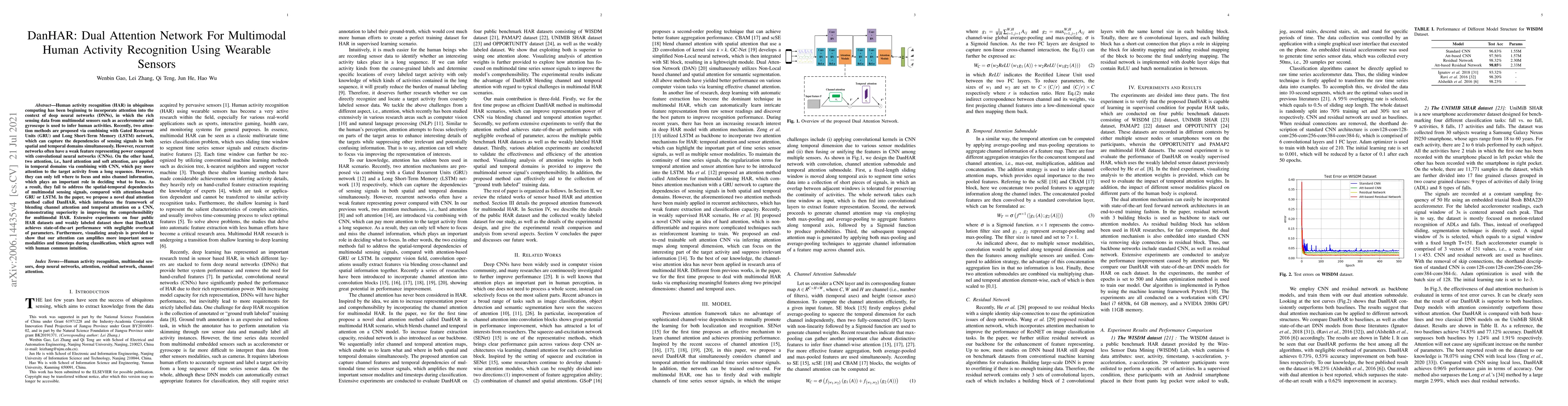 Human activity recognition (HAR) in ubiquitous computing has been beginning to incorporate attention into the context of deep neural networks (DNNs), in which the rich sensing data from multimodal sensors such as accelerometer and gyroscope is used to infer human activities. Recently, two attention methods are proposed via combining with Gated Recurrent Units (GRU) and Long Short-Term Memory (LSTM) network, which can capture the dependencies of sensing signals in both spatial and temporal domains simultaneously. However, recurrent networks often have a weak feature representing power compared with convolutional neural networks (CNNs). On the other hand, two attention, i.e., hard attention and soft attention, are applied in temporal domains via combining with CNN, which pay more attention to the target activity from a long sequence. However, they can only tell where to focus and miss channel information, which plays an important role in deciding what to focus. As a result, they fail to address the spatial-temporal dependencies of multimodal sensing signals, compared with attention-based GRU or LSTM. In the paper, we propose a novel dual attention method called DanHAR, which introduces the framework of blending channel attention and temporal attention on a CNN, demonstrating superiority in improving the comprehensibility for multimodal HAR. Extensive experiments on four public HAR datasets and weakly labeled dataset show that DanHAR achieves state-of-the-art performance with negligible overhead of parameters. Furthermore, visualizing analysis is provided to show that our attention can amplifies more important sensor modalities and timesteps during classification, which agrees well with human common intuition.