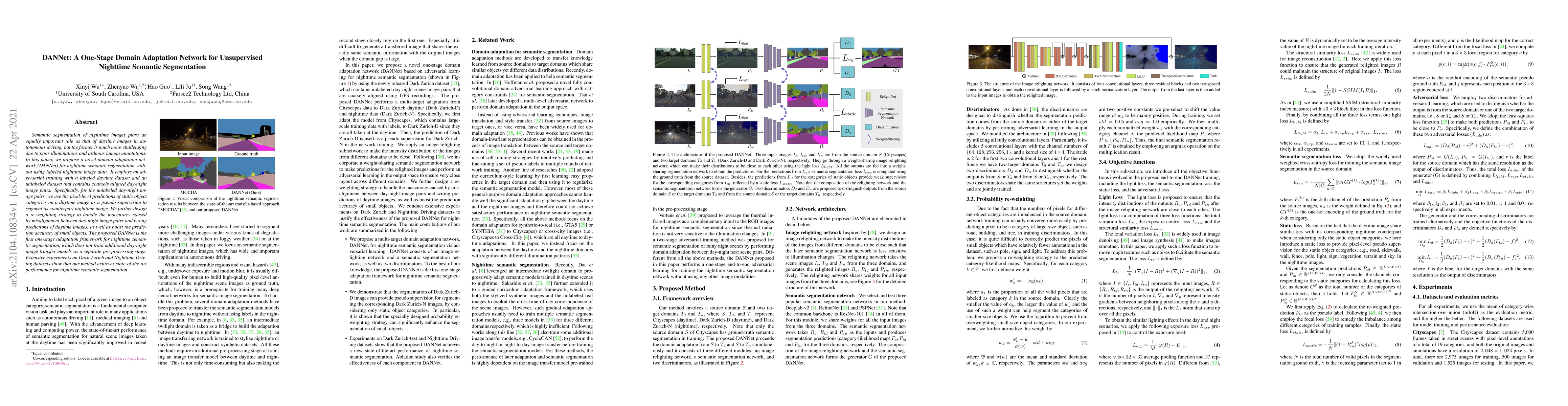 DANNet is a one-stage domain adaptation network for unsupervised nighttime semantic segmentation using adversarial training with daytime labeled data and unlabeled day-night image pairs. It achieves state-of-the-art performance without requiring separate pre-processing for day-night image transfer.