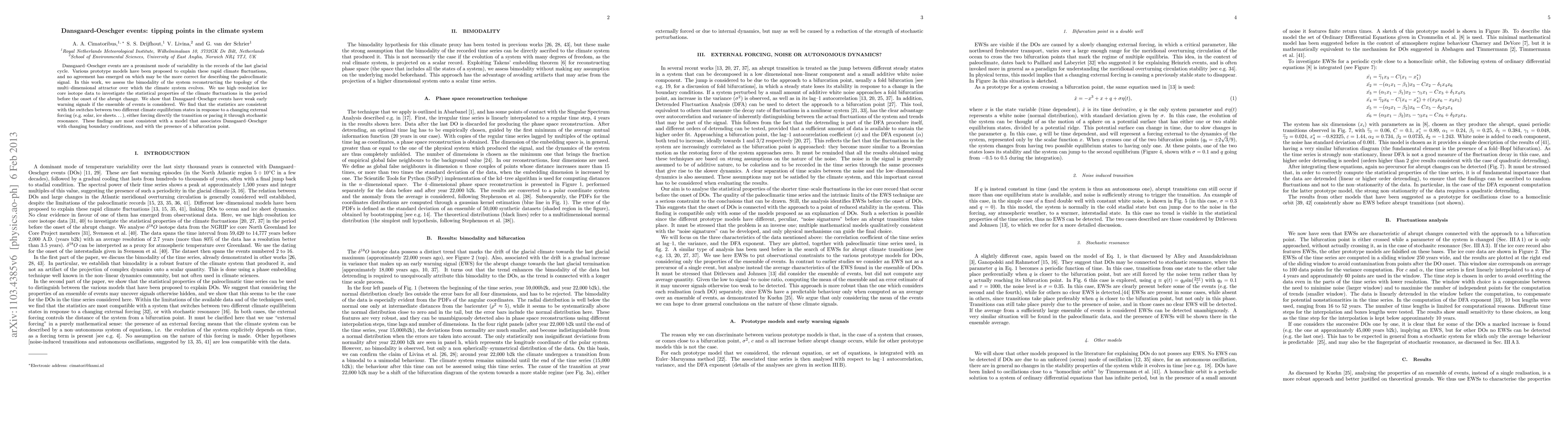 Dansgaard-Oeschger events are a prominent mode of variability in the records of the last glacial cycle. Various prototype models have been proposed to explain these rapid climate fluctuations, and no agreement has emerged on which may be the more correct for describing the paleoclimatic signal. In this work, we assess the bimodality of the system reconstructing the topology of the multi--dimensional attractor over which the climate system evolves. We use high-resolution ice core isotope data to investigate the statistical properties of the climate fluctuations in the period before the onset of the abrupt change. We show that Dansgaard-Oeschger events have weak early warning signals if the ensemble of events is considered. We find that the statistics are consistent with the switches between two different climate equilibrium states in response to a changing external forcing (e.g. solar, ice sheets...), either forcing directly the transition or pacing it through stochastic resonance. These findings are most consistent with a model that associates Dansgaard-Oeschger with changing boundary conditions, and with the presence of a bifurcation point.