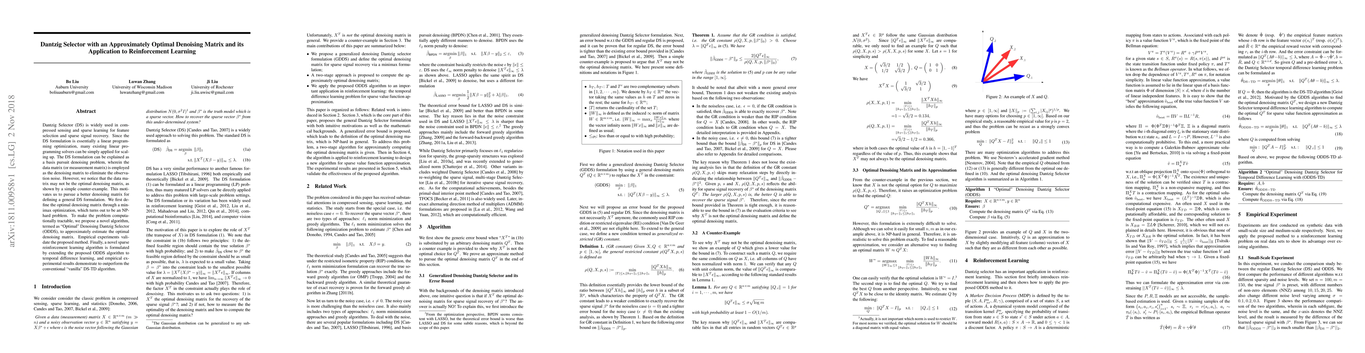 The paper proposes an Optimal Denoising Dantzig Selector (ODDS) to approximate the optimal denoising matrix, improving the Dantzig Selector for feature selection and sparse signal recovery. The ODDS algorithm outperforms conventional methods in sparse reinforcement learning applications.