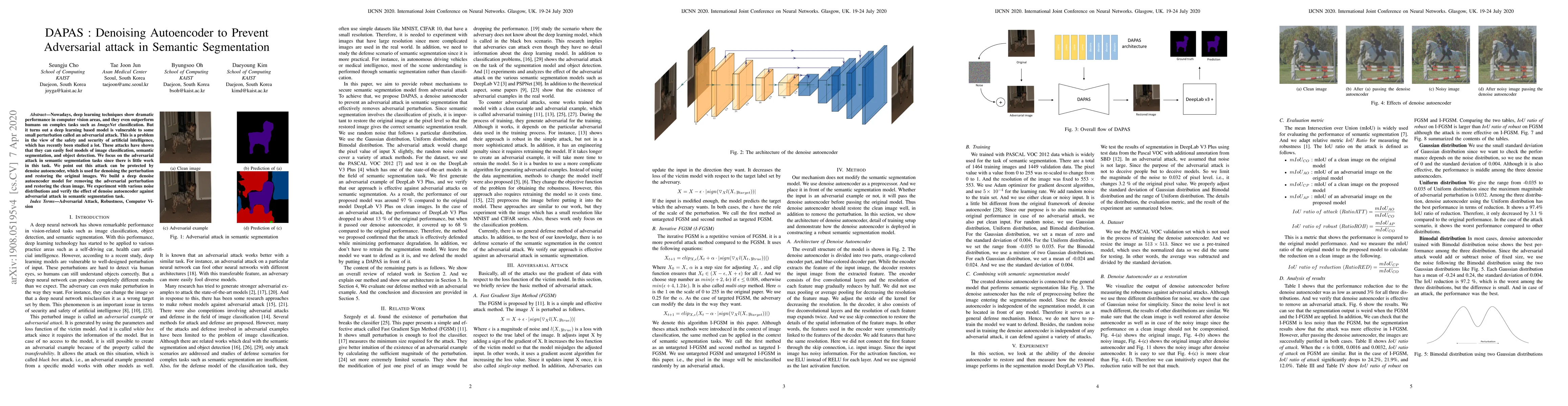 Title: DAPAS: Denoising Autoencoder to Prevent Adversarial Attack in Semantic Segmentation Summary: This paper proposes a denoising autoencoder (DAPAS) to mitigate adversarial attacks in semantic segmentation by denoising perturbations and restoring original images, demonstrating effectiveness across various noise distributions.
