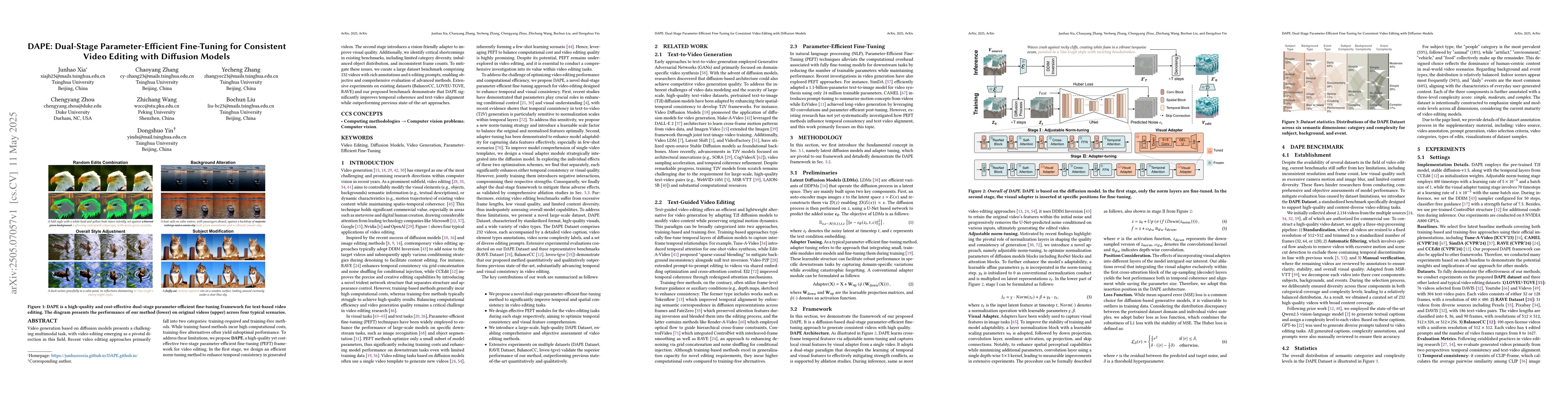 DAPE distinguishes itself by focusing on a two-stage fine-tuning strategy specifically tailored for video editing with diffusion models, addressing both temporal consistency and visual quality, while also proposing a comprehensive benchmark to evaluate advanced video editing methods.