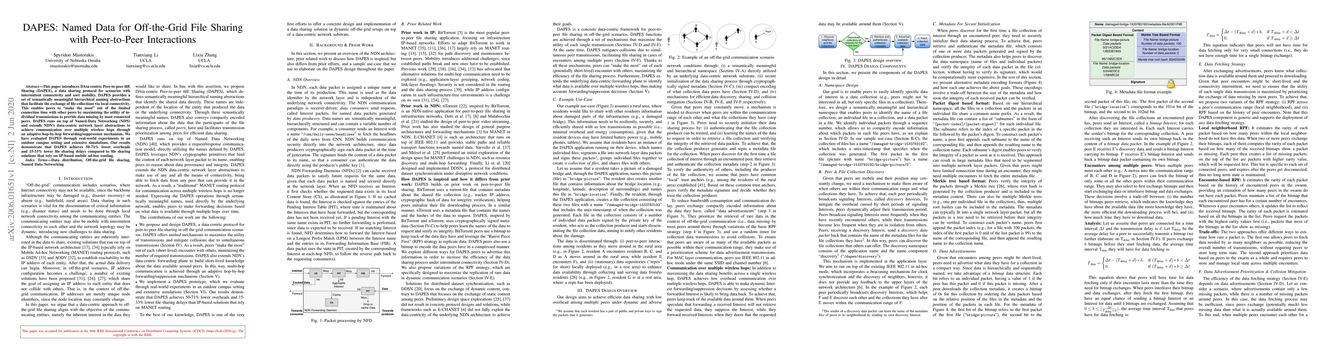 DAPES is a data-centric peer-to-peer file sharing protocol designed for intermittent connectivity and user mobility, utilizing Named-Data Networking to optimize data exchange. Evaluations show DAPES reduces overheads by 50-71% and delays by 15-33% compared to IP-based mobile ad-hoc routing.