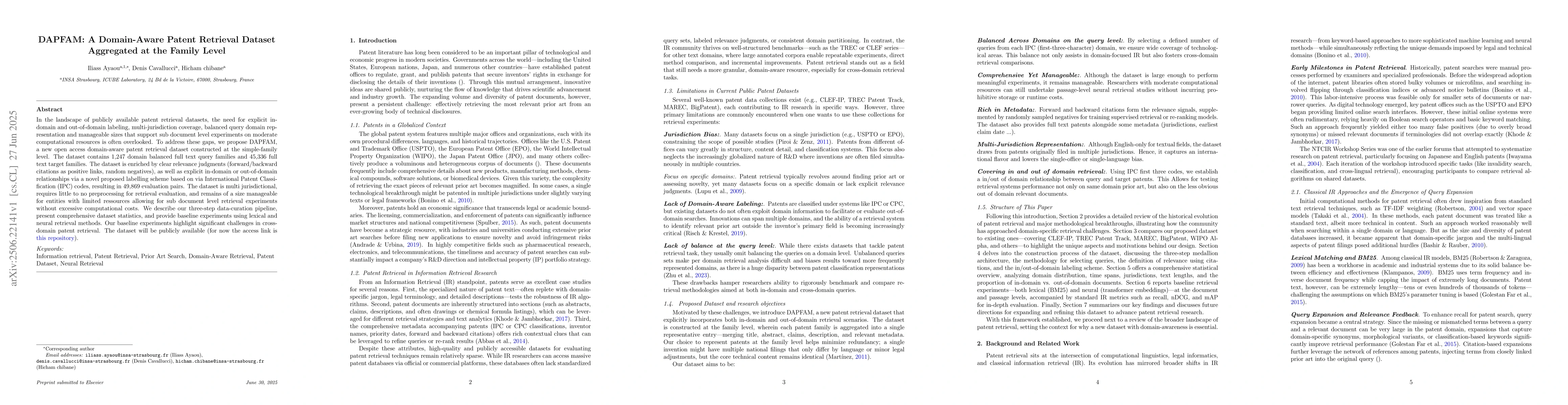 In the landscape of publicly available patent retrieval datasets, the need for explicit indomain and out-of-domain labeling, multi-jurisdiction coverage, balanced query domain representation and manageable sizes that support sub document level experiments on moderate computational resources is often overlooked. To address these gaps, we propose DAPFAM, a new open access domain-aware patent retrieval dataset constructed at the simple-family level. The dataset contains 1,247 domain balanced full text query families and 45,336 full text target families. The dataset is enriched by clear relevance judgments (forward/backward citations as positive links, random negatives), as well as explicit in-domain or out-of-domain relationships via a novel proposed labelling scheme based on via International Patent Classification (IPC) codes, resulting in 49,869 evaluation pairs. The dataset is multi jurisdictional, requires little to no preprocessing for retrieval evaluation, and remains of a size manageable for entities with limited ressources allowing for sub document level retrieval experiments without excessive computational costs. We describe our three-step data-curation pipeline, present comprehensive dataset statistics, and provide baseline experiments using lexical and neural retrieval methods. Our baseline experiments highlight significant challenges in crossdomain patent retrieval. The dataset will be publicly available (for now the access link is this repository: https://osf.io/vbyzd/?view_only=1a40242e0d1941a58aa854af3e50cf6b).