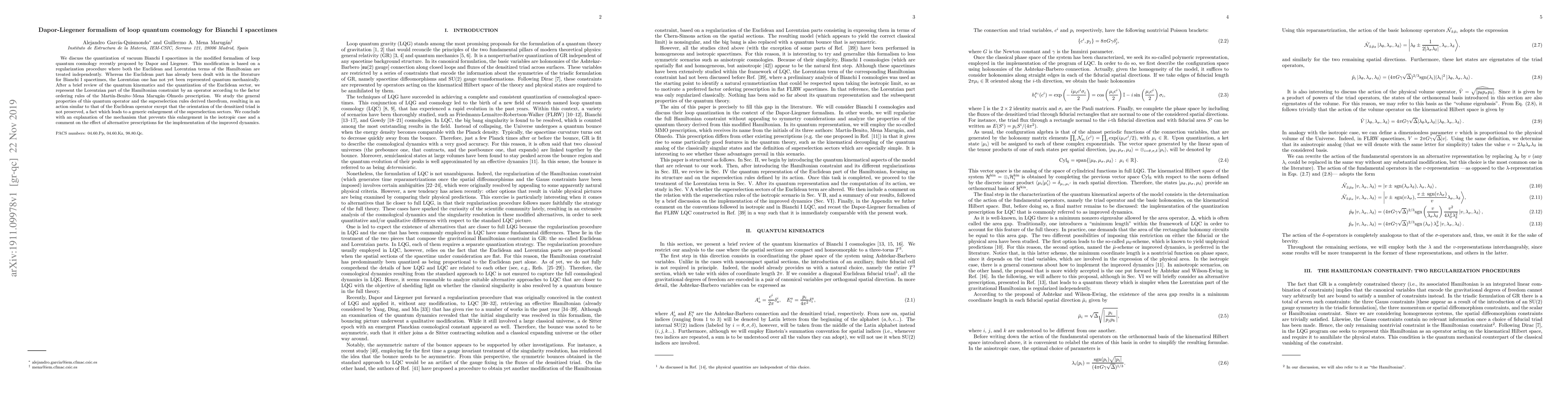 We discuss the quantization of vacuum Bianchi I spacetimes in the modified formalism of loop quantum cosmology recently proposed by Dapor and Liegener. This modification is based on a regularization procedure where both the Euclidean and Lorentzian terms of the Hamiltonian are treated independently. Whereas the Euclidean part has already been dealt with in the literature for Bianchi I spacetimes, the Lorentzian one has not yet been represented quantum mechanically. After a brief review of the quantum kinematics and the quantization of the Euclidean sector, we represent the Lorentzian part of the Hamiltonian constraint by an operator according to the factor ordering rules of the Martin-Benito--Mena Marugan--Olmedo prescription. We study the general properties of this quantum operator and the superselection rules derived therefrom, resulting in an action similar to that of the Euclidean operator except that the orientation of the densitized triad is not preserved, a fact which leads to a generic enlargement of the superselection sectors. We conclude with an explanation of the mechanism that prevents this enlargement in the isotropic case and a comment on the effect of alternative prescriptions for the implementation of the improved dynamics.