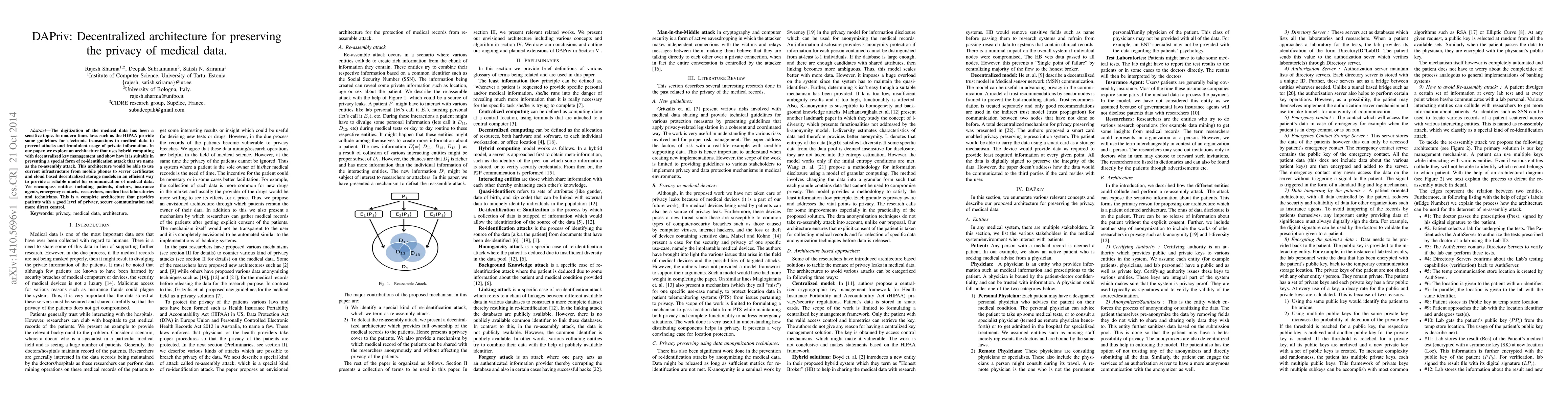 The paper proposes DAPriv, a decentralized architecture for safeguarding medical data privacy using hybrid computing and decentralized key management to prevent re-assembly attacks. It leverages existing infrastructure to ensure secure communication and enhanced control for patients.