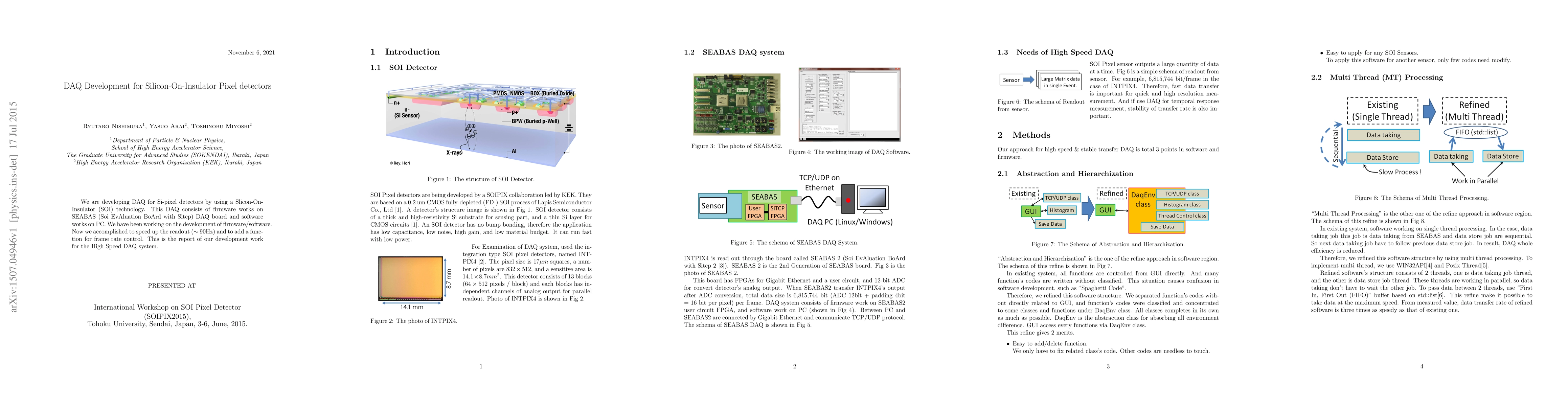 This research paper details the development of a high-speed DAQ system for Silicon-On-Insulator (SOI) pixel detectors, utilizing SEABAS DAQ board and PC-based software. The team successfully enhanced readout speed to ~90Hz and implemented frame rate control functionality.