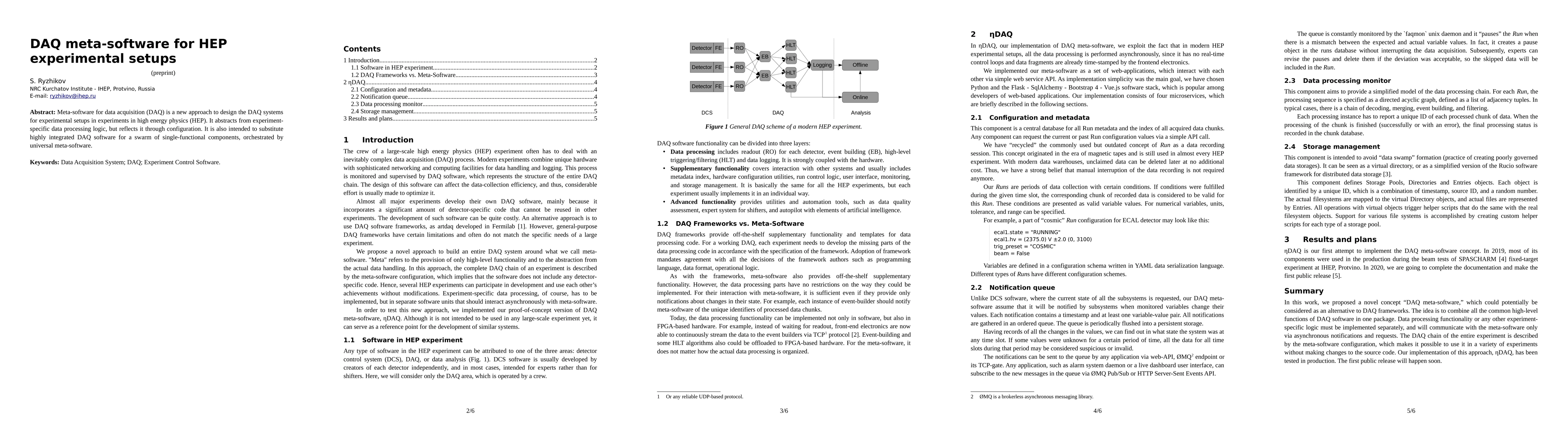 This paper introduces meta-software for data acquisition (DAQ) in high energy physics (HEP) experiments, which abstracts experiment-specific data processing logic through configuration, aiming to replace complex DAQ systems with a universal orchestration of single-functional components.