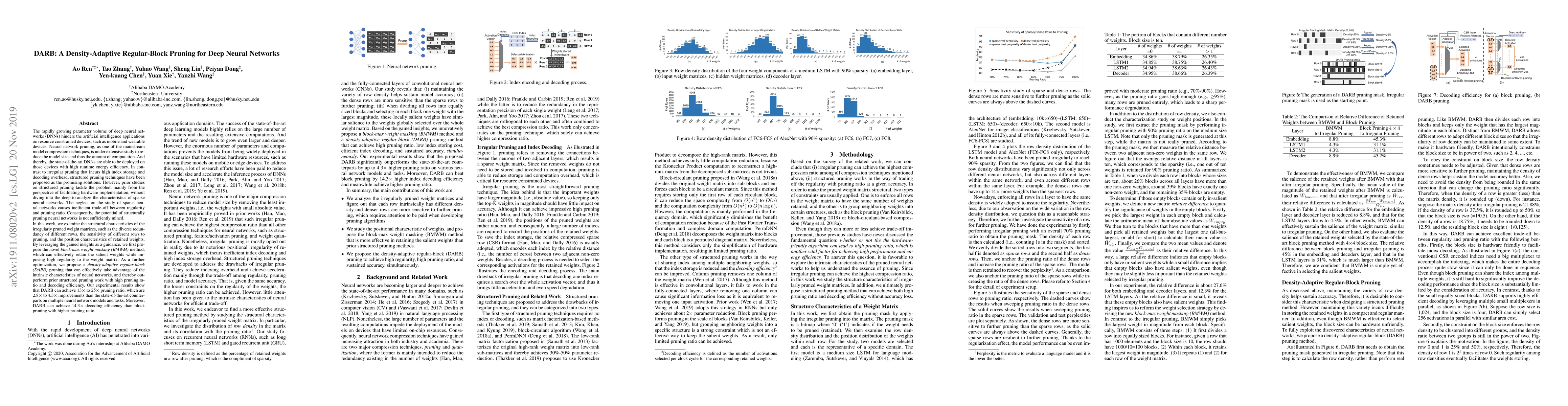 This paper proposes DARB, a density-aware regular-block pruning method for deep neural networks, to achieve high pruning ratios and decoding efficiency. It introduces BMWM to retain salient weights while maintaining regularity, and DARB to optimize this process, achieving significant improvements over existing structured pruning techniques.