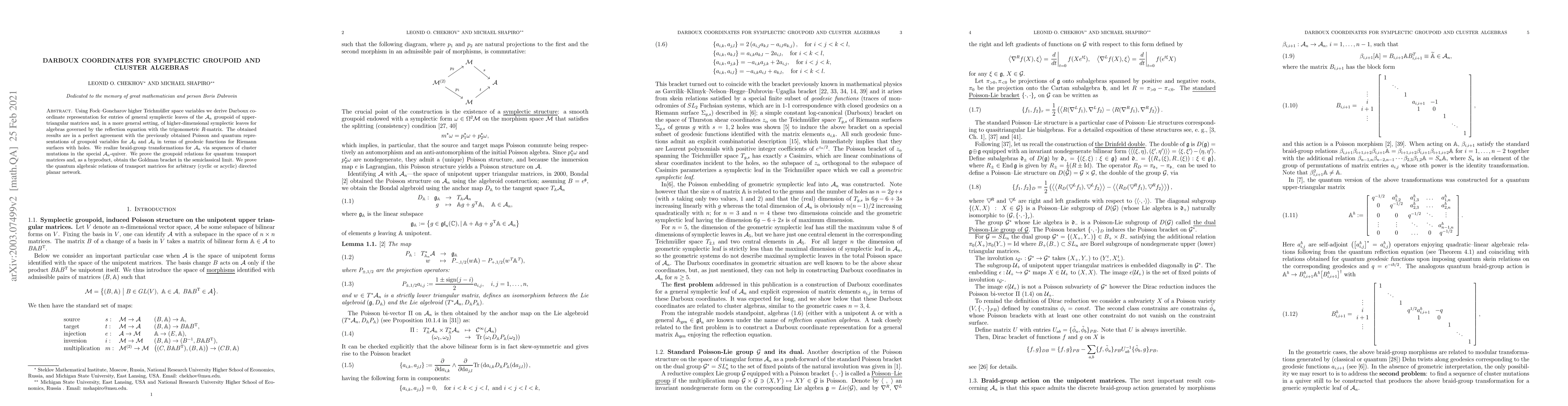Using Fock--Goncharov higher Teichm\"uller space variables we derive Darboux coordinate representation for entries of general symplectic leaves of the $\mathcal A_n$ groupoid of upper-triangular matrices and, in a more general setting, of higher-dimensional symplectic leaves for algebras governed by the reflection equation with the trigonometric $R$-matrix. The obtained results are in a perfect agreement with the previously obtained Poisson and quantum representations of groupoid variables for $\mathcal A_3$ and $\mathcal A_4$ in terms of geodesic functions for Riemann surfaces with holes. We represent braid-group transformations for $\mathcal A_n$ via sequences of cluster mutations in the special $\mathbb A_n$-quiver. We prove the groupoid relations for quantum transport matrices and, as a byproduct, obtain the Goldman bracket in the semiclassical limit.