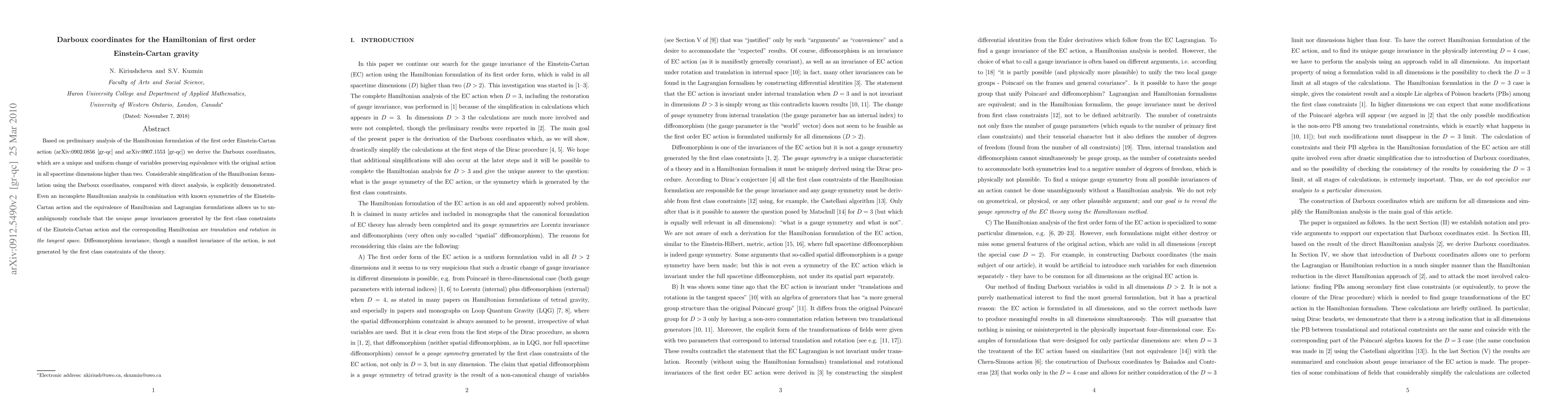 This paper derives Darboux coordinates for the first-order Einstein-Cartan action, simplifying its Hamiltonian formulation. It concludes that the gauge invariances from the first-class constraints are translation and rotation in the tangent space, while diffeomorphism invariance is not generated by these constraints.