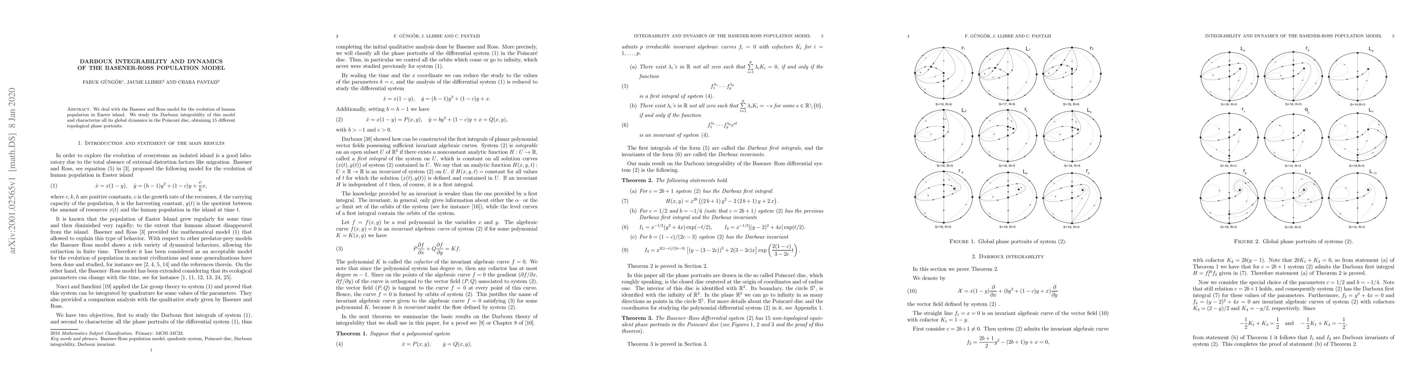 This paper investigates the Darboux integrability and global dynamics of the Basener-Ross model for Easter Island's population evolution, revealing 15 distinct topological phase portraits within the Poincaré disc. The study characterizes the model's complete dynamical behavior.
