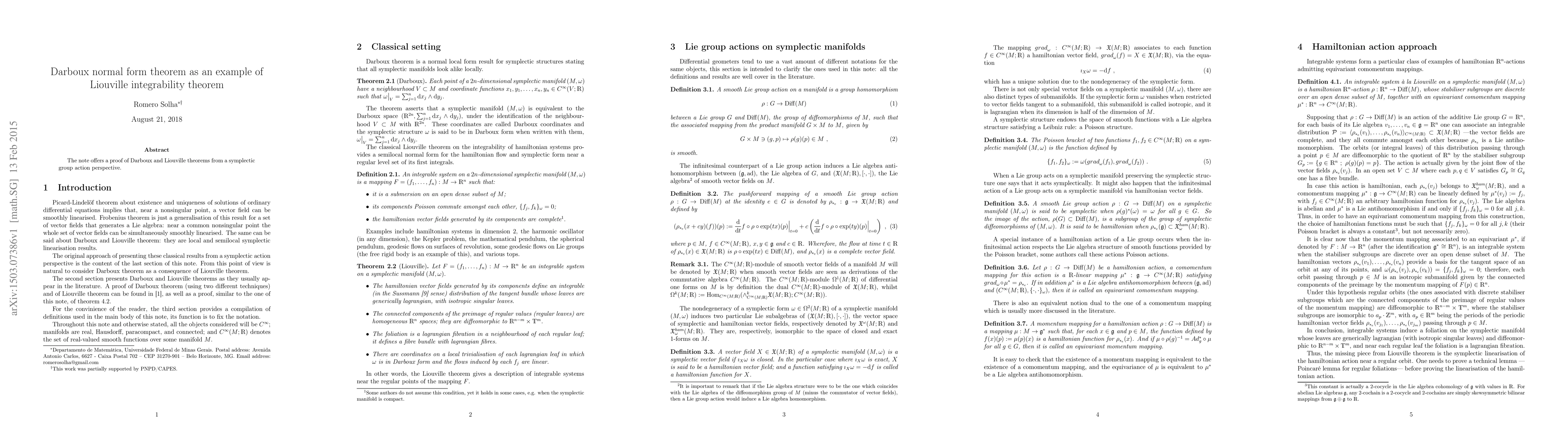 The note offers a proof of Darboux and Liouville theorems from a symplectic group action perspective.