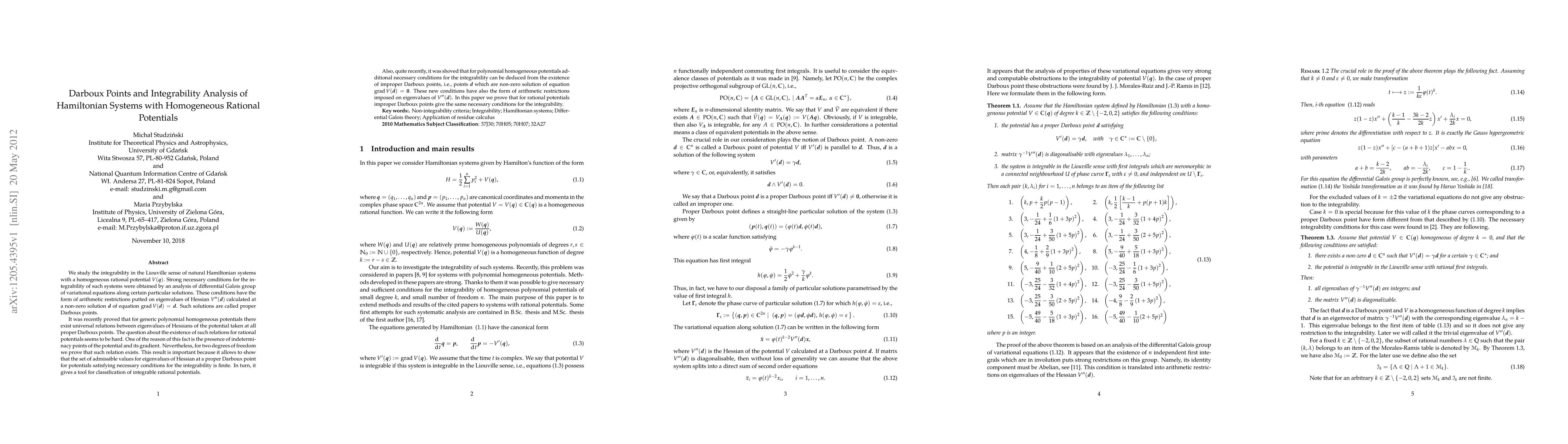 We study the integrability in the Liouville sense of natural Hamiltonian systems with a homogeneous rational potential $V(\vq)$. Strong necessary conditions for the integrability of such systems were obtained by an analysis of differential Galois group of variational equations along certain particular solutions. These conditions have the form of arithmetic restrictions putted on eigenvalues of Hessian $V"(\vd)$ calculated at a non-zero solution $\vd$ of equation $\grad V(\vd)=\vd$. Such solutions are called proper Darboux points. It was recently proved that for generic polynomial homogeneous potentials there exist universal relations between eigenvalues of Hessians of the potential taken at all proper Darboux points. The question about the existence of such relations for rational potentials seems to be hard. One of the reason of this fact is the presence of indeterminacy points of the potential and its gradient. Nevertheless, for two degrees of freedom we prove that such relation exists. This result is important because it allows to show that the set of admissible values for eigenvalues of Hessian at a proper Darboux point for potentials satisfying necessary conditions for the integrability is finite. In turn, it gives a tool for classification of integrable rational potentials. Also, quite recently, it was shoved that for polynomial homogeneous potentials additional necessary conditions for the integrability can be deduced from the existence of improper Darboux points, i.e., points $\vd$ which are non-zero solution of equation $\grad V(\vd)=\vzero$. These new conditions have also the form of arithmetic restrictions imposed on eigenvalues of $V"(\vd)$. In this paper we prove that for rational potentials improper Darboux points give the same necessary conditions for the integrability.