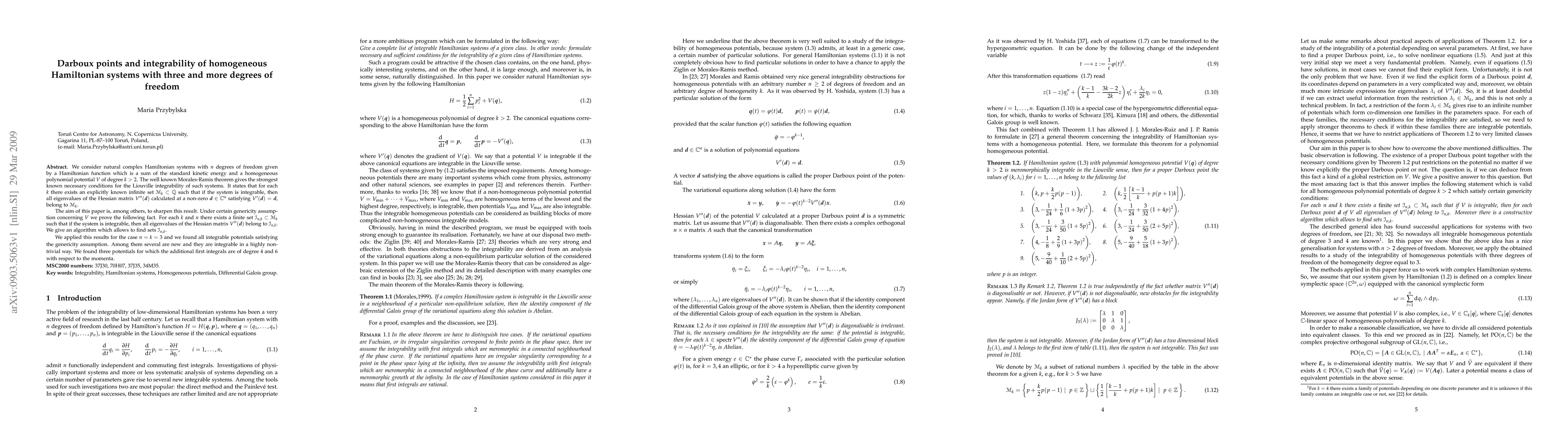 This paper refines the Morales-Ramis theorem on the integrability of complex Hamiltonian systems with $n$ degrees of freedom and a homogeneous potential $V$ of degree $k>2$. It introduces a finite set $\scI_{n,k}$ of necessary conditions for integrability, improving upon the previously known infinite set $\scM_k$. The authors provide an algorithm to determine these sets and apply it to the case $n=k=3$, discovering several new integrable potentials with non-trivial first integrals.