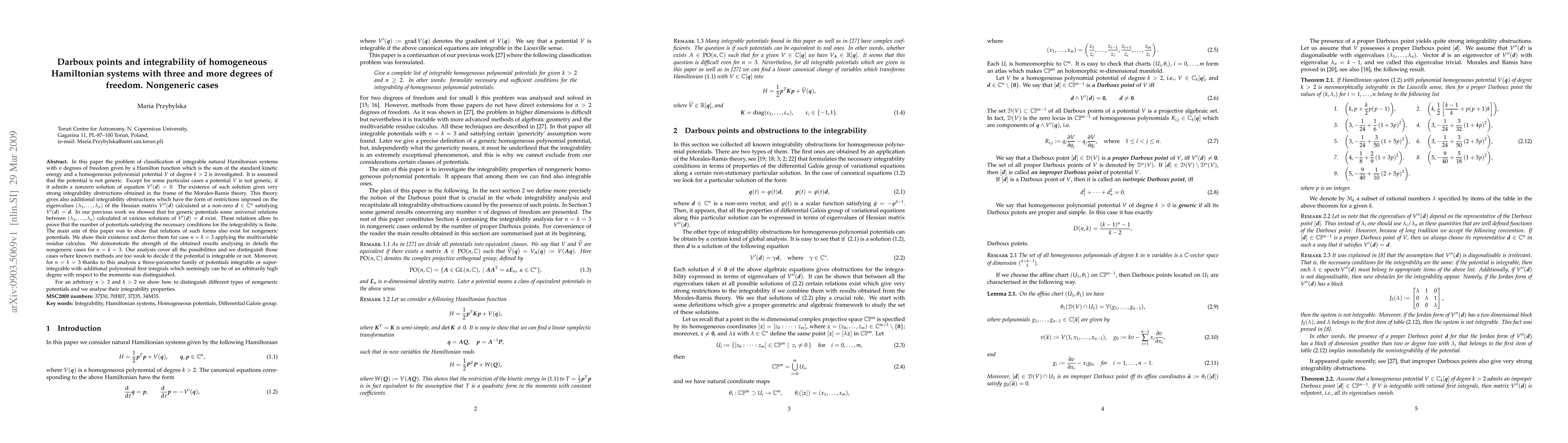 This paper investigates the classification of integrable Hamiltonian systems with $n$ degrees of freedom, where the potential is nongeneric and admits Darboux points. The Morales-Ramis theory reveals strong integrability obstructions, and the authors derive universal relations for nongeneric potentials, particularly for $n=k=3$, identifying a three-parameter family of integrable or super-integrable potentials with high-degree polynomial first integrals.