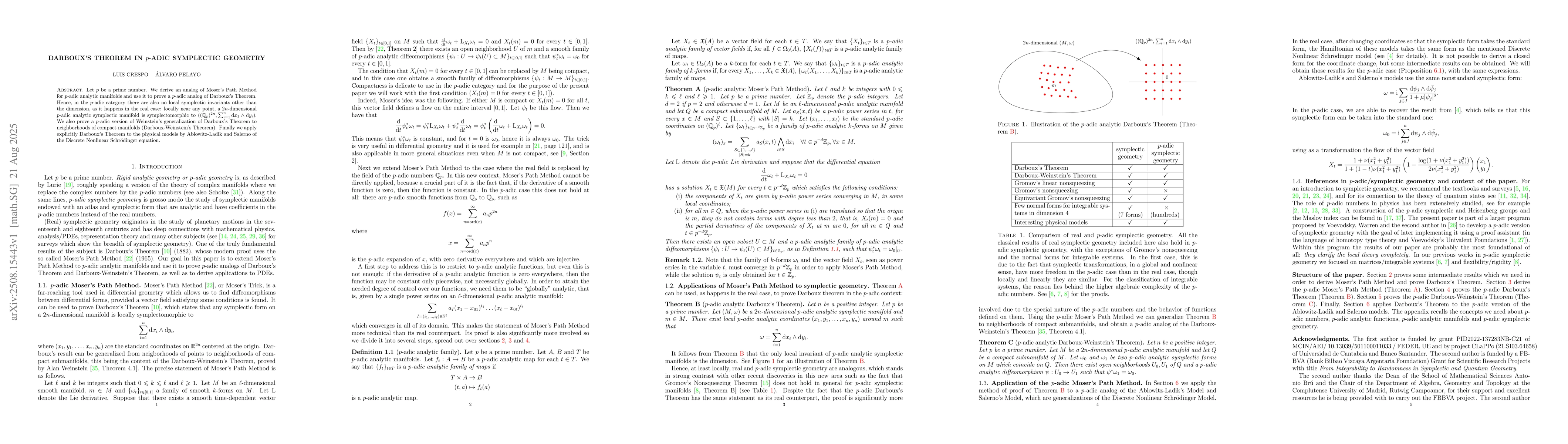 Let $p$ be a prime number. We derive an analog of Moser's Path Method for $p$-adic analytic manifolds and use it to prove a $p$-adic analog of Darboux's Theorem. Hence, in the $p$-adic category there are also no local symplectic invariants other than the dimension, as it happens in the real case: locally near any point, a $2n$-dimensional $p$-adic analytic symplectic manifold is symplectomorphic to $((\mathbb{Q}_p)^{2n},\sum_{i=1}^n\mathrm{d} x_1\wedge\mathrm{d} y_i)$. We also prove a $p$-adic version of Weinstein's generalization of Darboux's Theorem to neighborhoods of compact manifolds (Darboux-Weinstein's Theorem). Finally we apply explicitly Darboux's Theorem to the physical models by Ablowitz-Ladik and Salerno of the Discrete Nonlinear Schr\"odinger equation.