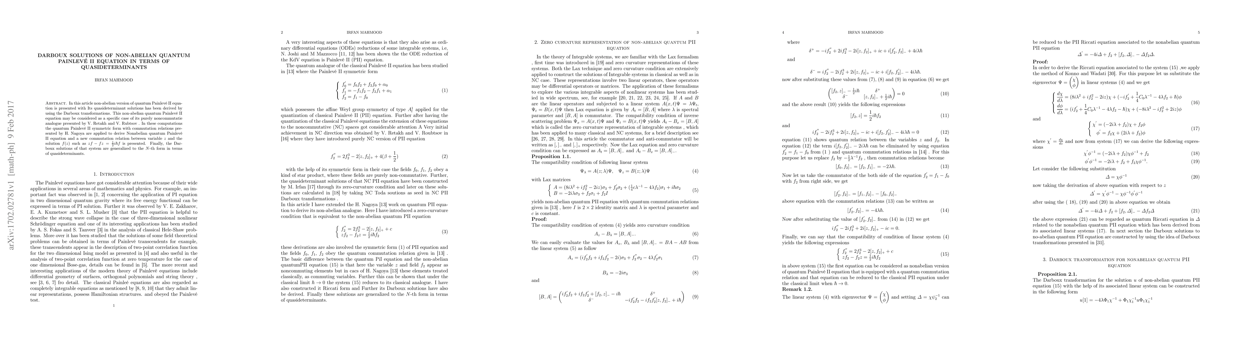 In this article non-abelian version of quantum Painlev\'e II equation is presented with Its quasideterminant solutions has been derived by using the Darboux transformations. This non-abelian quantum Painlev\'e II equation may be considered as a specific case of its purely noncommutatie analogue presented by V. Retakh and V. Rubtsov . In these computations the quantum Painlev\'e II symmetric form with commutation relations presented by H. Nagoya are applied to derive Nonabelian quantum Painlev\'e II equation and a new commutation relation between variable $z$ and the solution $ f(z)$ such as $ z f - f z = \frac{1}{2} i \hbar f $ is presented. Finally, the Darboux solutions of that system are generalized to the $N$-th form in terms of quasideterminants.