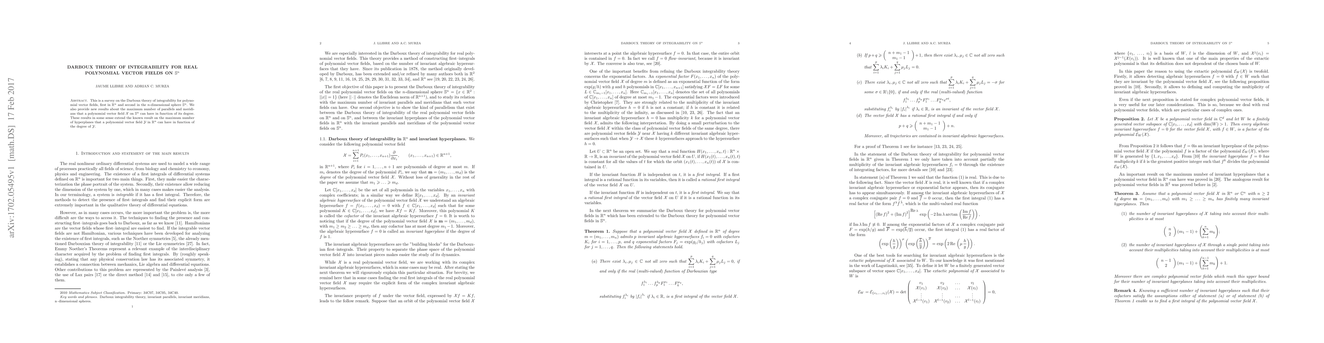 This is a survey on the Darboux theory of integrability for polynomial vector fields, first in $\R^n$ and second in the $n$-dimensional sphere $\sss^n$. We also provide new results about the maximum number of parallels and meridians that a polynomial vector field $\X$ on $\sss^n$ can have in function of its degree. These results in some sense extend the known result on the maximum number of hyperplanes that a polynomial vector field $\Y$ in $\R^n$ can have in function of the degree of $\Y$.