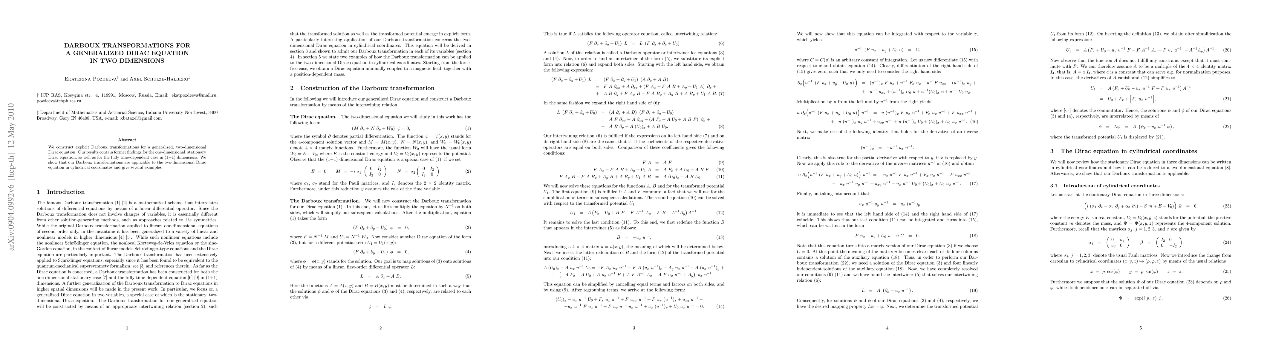 This paper constructs explicit Darboux transformations for a generalized two-dimensional Dirac equation, extending previous findings for one-dimensional cases and demonstrating applicability to cylindrical coordinates. Several examples illustrate the utility of these transformations.
